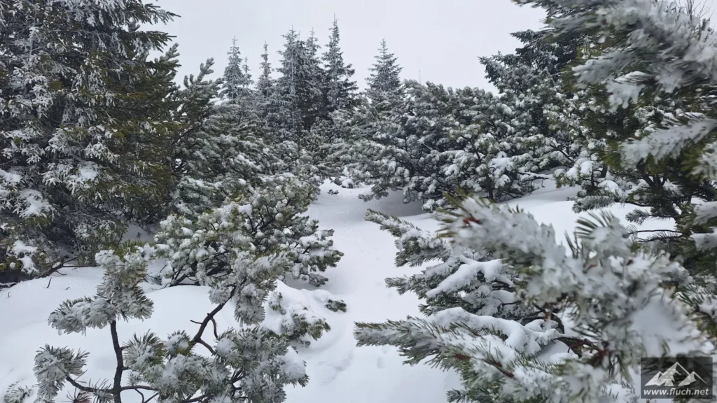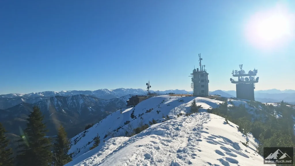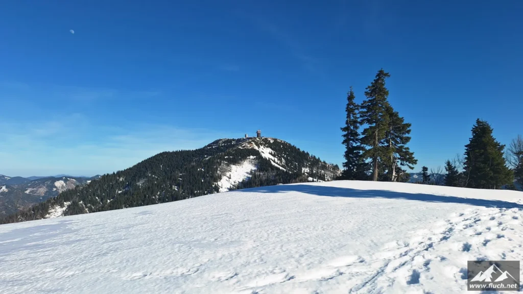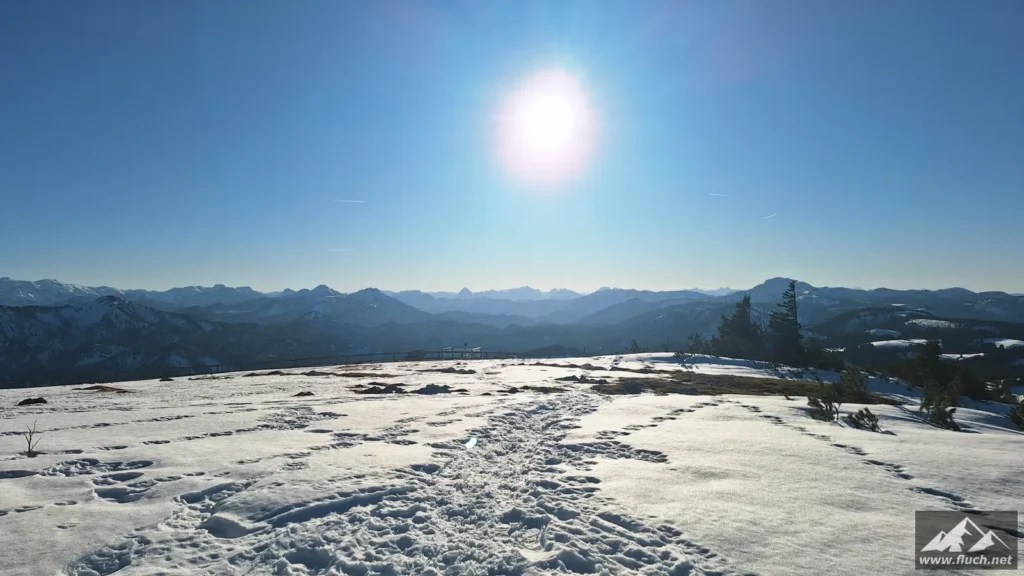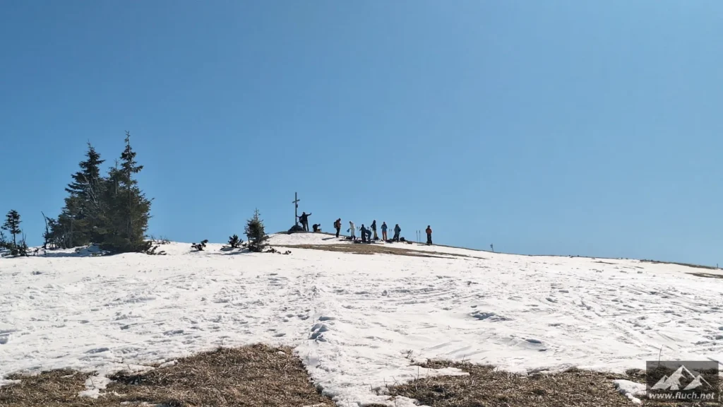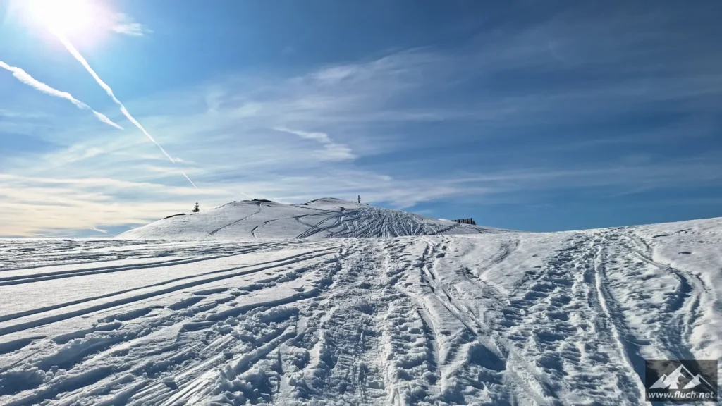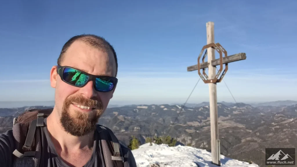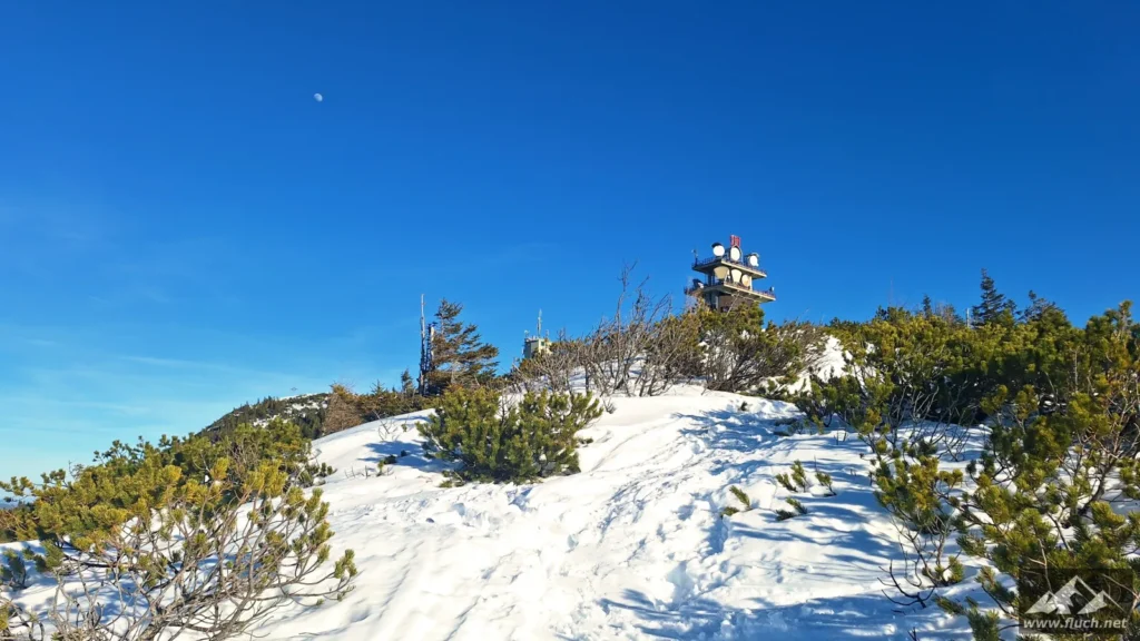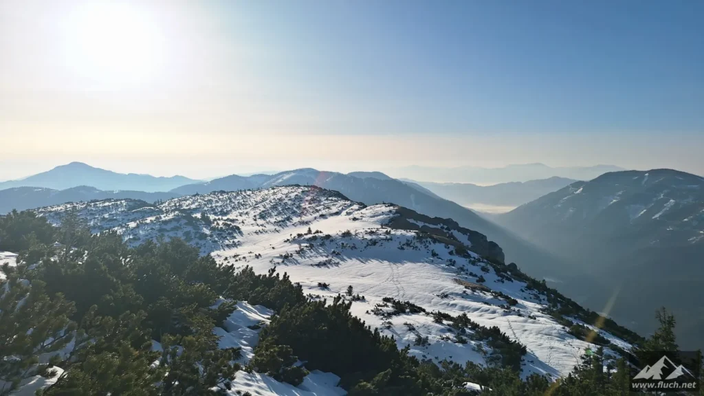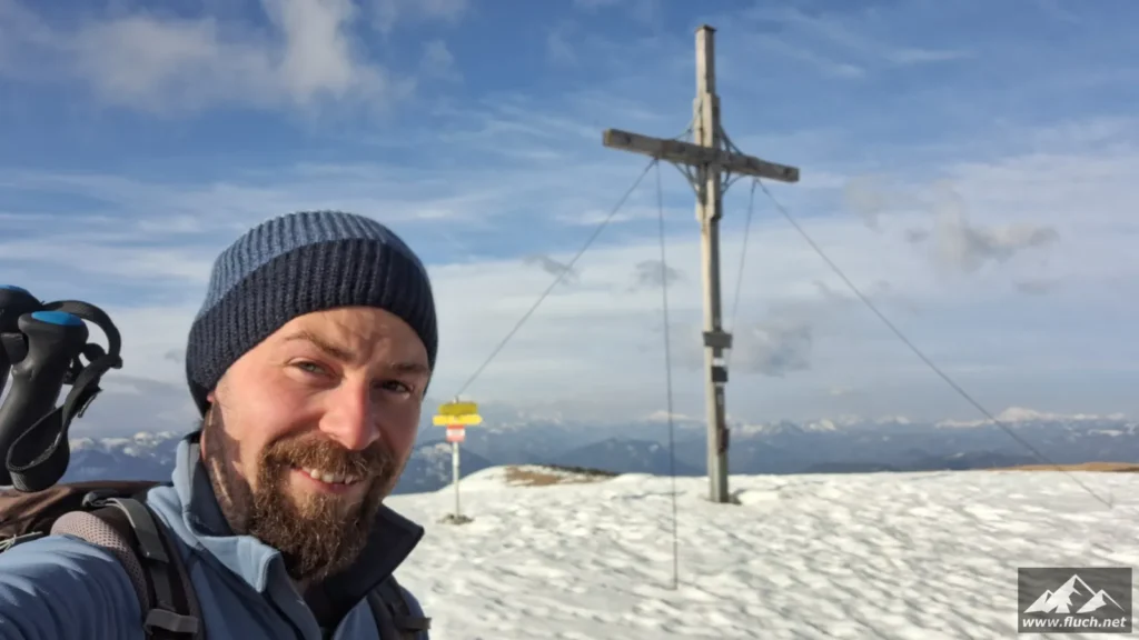 Weil es noch nicht so spät war entschloss ich mich spontan noch die Hohe Wetterin als „Zugabe“ zu besuchen. Also bin ich mit dem Auto zum Niederalpl Pass gefahren und von dort dann mit den Schneeschuhen hinauf zum Gipfel der Hohen Wetterin. Über eine halbe Stunde lang war ich dann komplett alleine am Gipfel, also genoss ich die wärmende Sonne und die Ruhe (Sonnenbrand inklusive).