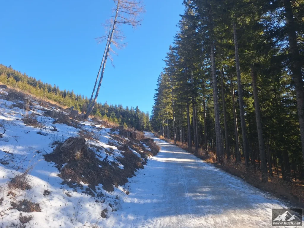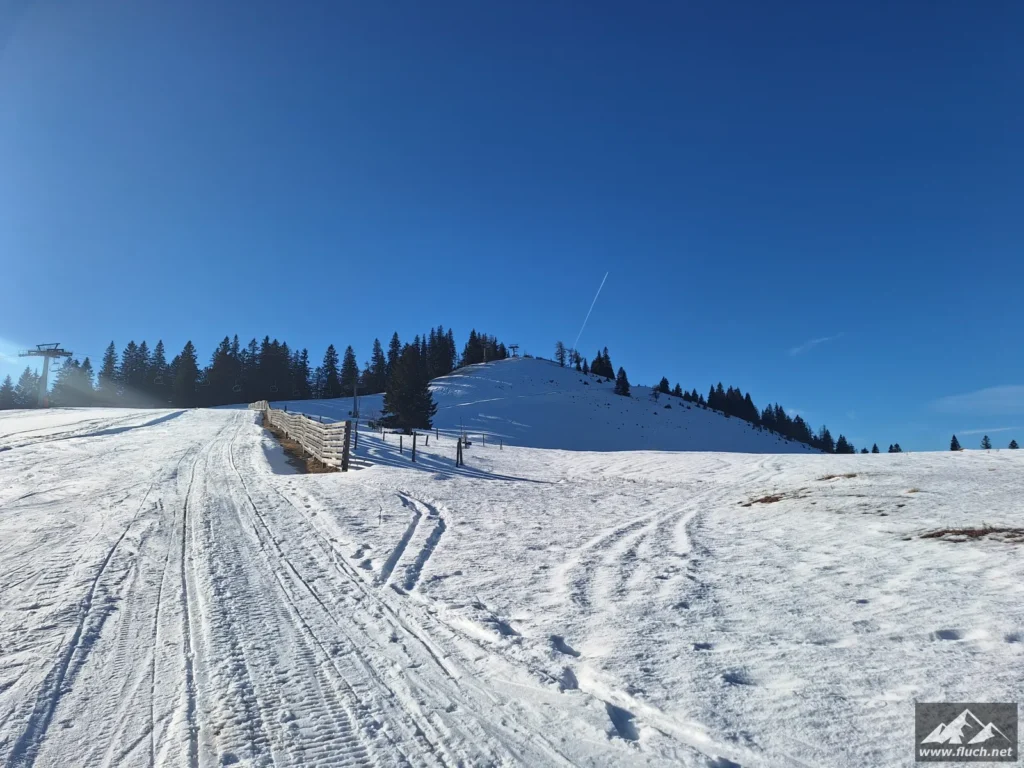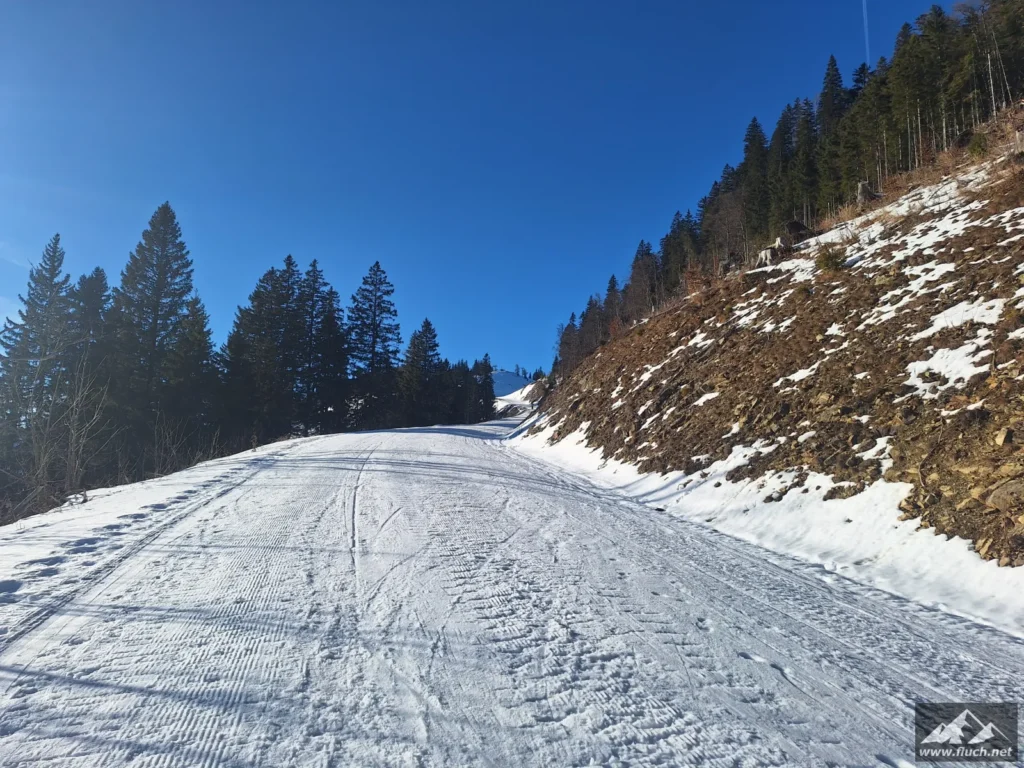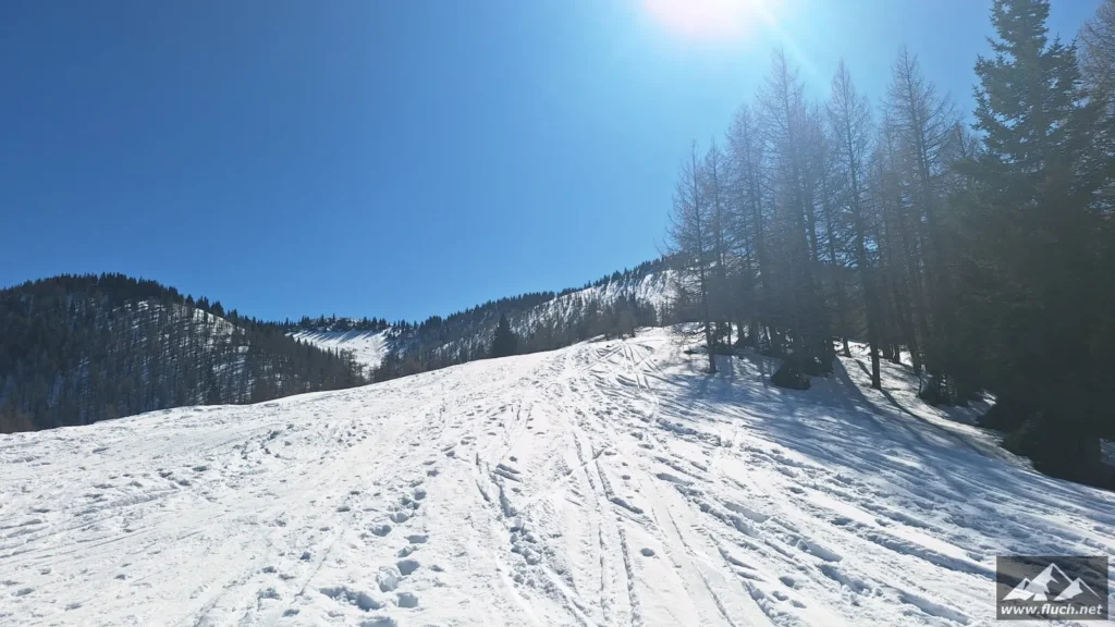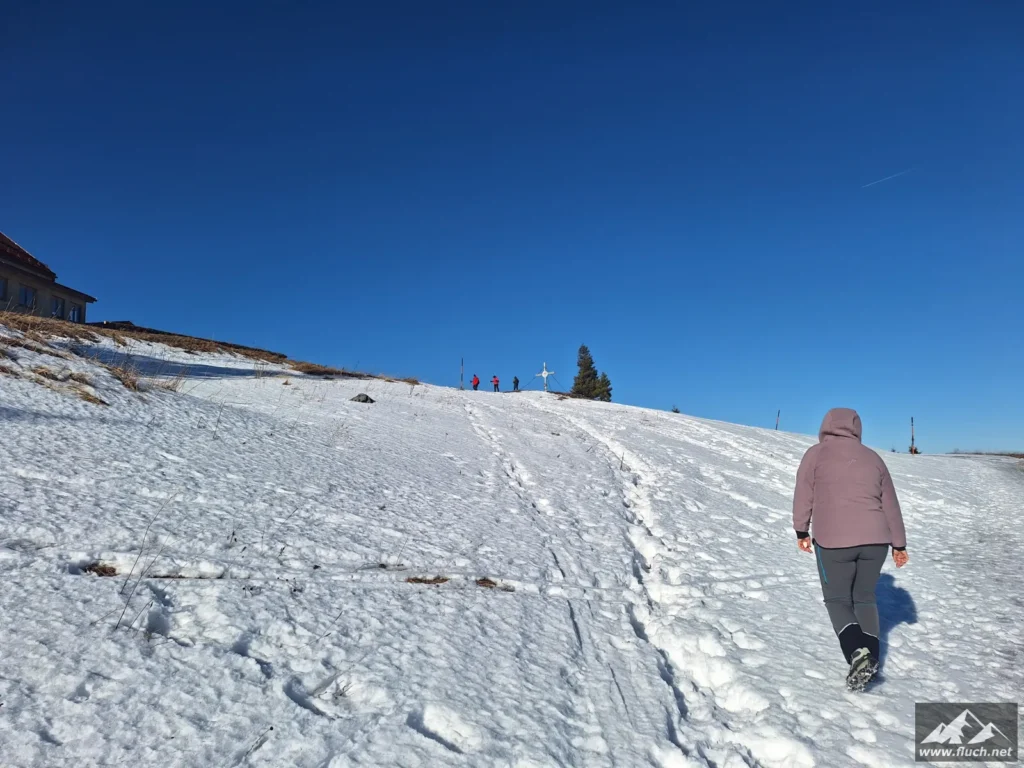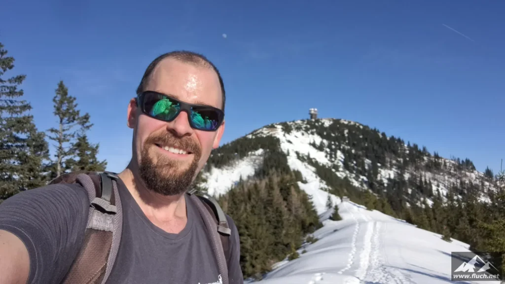 Eine kleine Erkundungstour auf unseren Hausberg stand heute am Programm. Von der Rasing ging es entlang der Straße inkl. einiger steiler Abkürzungen hinauf zum Gipfel. Spuren waren schon vorhanden, das erleichterte das vorankommen.