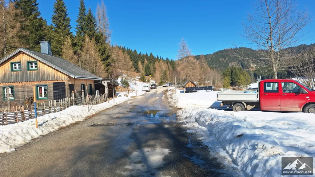 Ganz spontan sind wir heute bei wirklich eiskaltem und stürmischen Wetter von Schöneben zur Dürriegelalm hinauf gegangen. Eigentlich wollten wir ja nur etwas in den Freingraben hineinspazieren, aber die Straße wurde vor einiger Zeit geräumt und so konnten wir ohne Probleme bis in die Schöneben fahren (um diese Jahreszeit eigentlich absolut unmöglich).