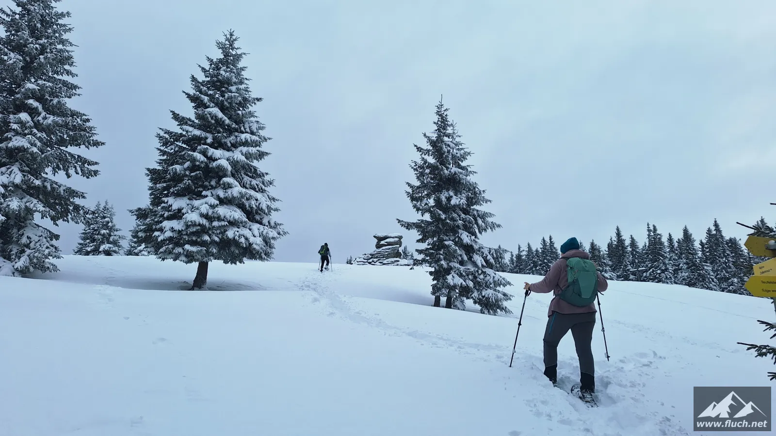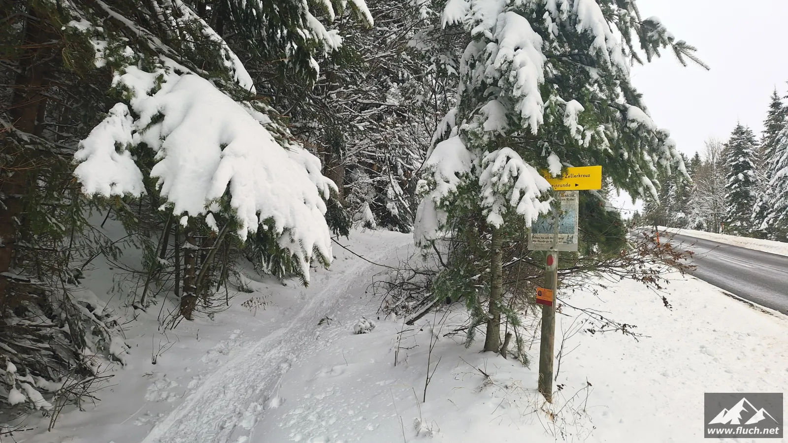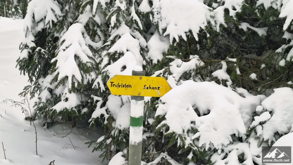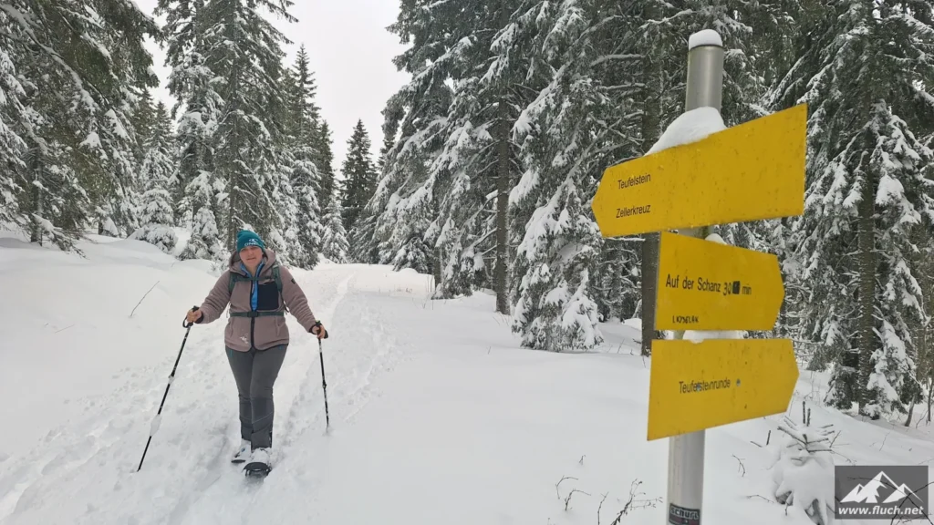 Start beim Zeller KreuzEs geht losSabine und TanjaEinige Spuren vorhandenHinauf durch den WaldSchlaferl? 😉Erste AusblickeEin steileres StückVorbei an der TeufelsteinhütteHinauf über die WieseNoch ein Stück durch den WaldDer Teufelstein ist in SichtDer winterliche TeufelsteinBlick von ganz obenTanja und Tom mussten natürlich ganz raufTanja und Tom am TeufelsteinBlick hinüber zum GipfelkreuzGipfelselfie, eh klar 😉Zurück zum Teufelstein und dann Abstieg zur SchanzDurch einen jungen WaldWinter WonderlandSchon wieder Pause?Sabine macht gleich mit 😉Bei der Abzweigung hinunter zur PisteMini-WegweiserHinunter über die Piste zum GasthausLeider geschlossenWieder hinein in den WaldDie Füße werden schwerEin letzter AnstiegNicht mehr Weit bis zum Auto
