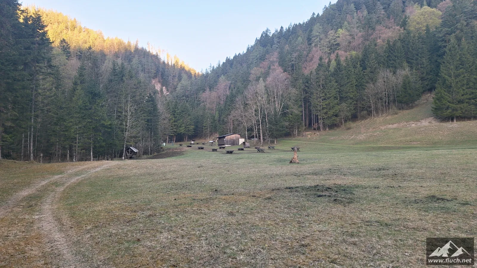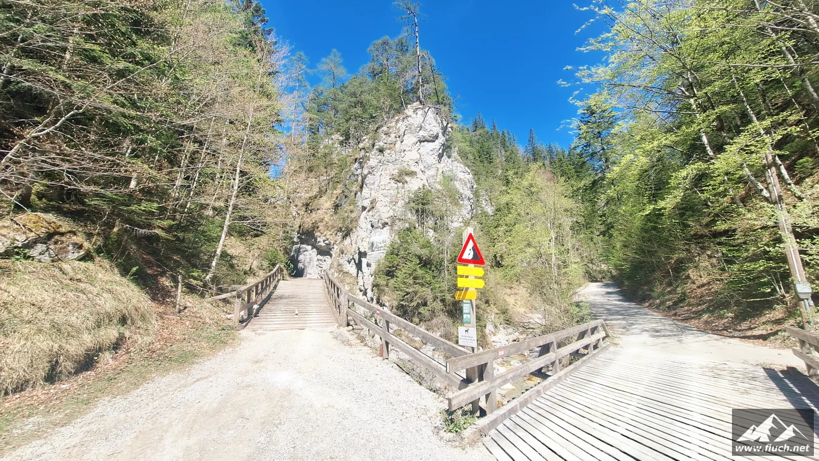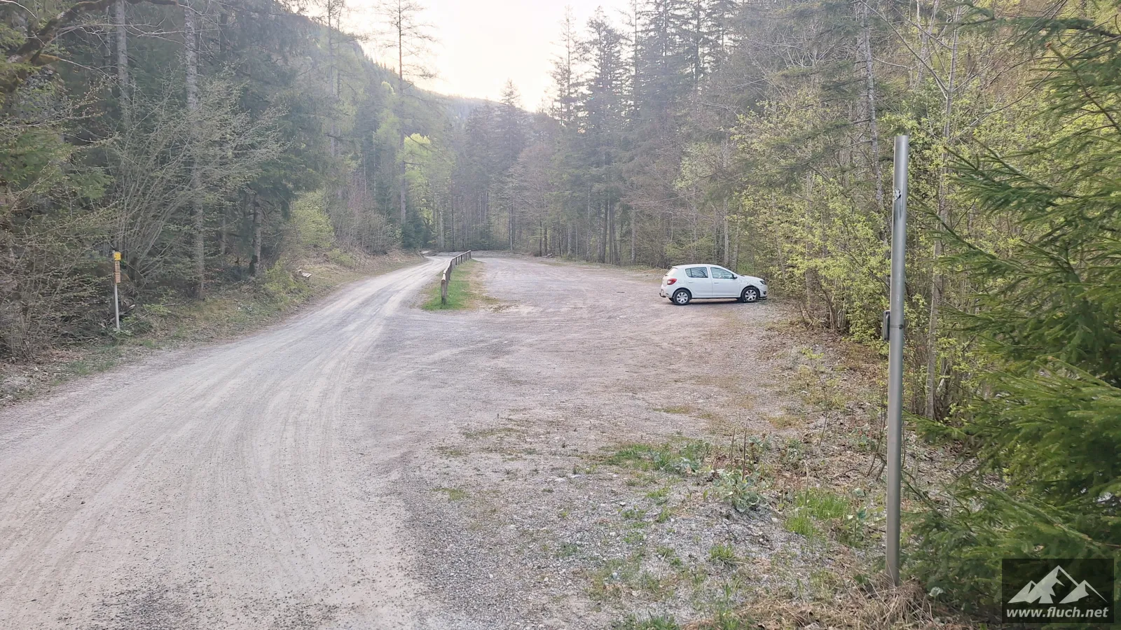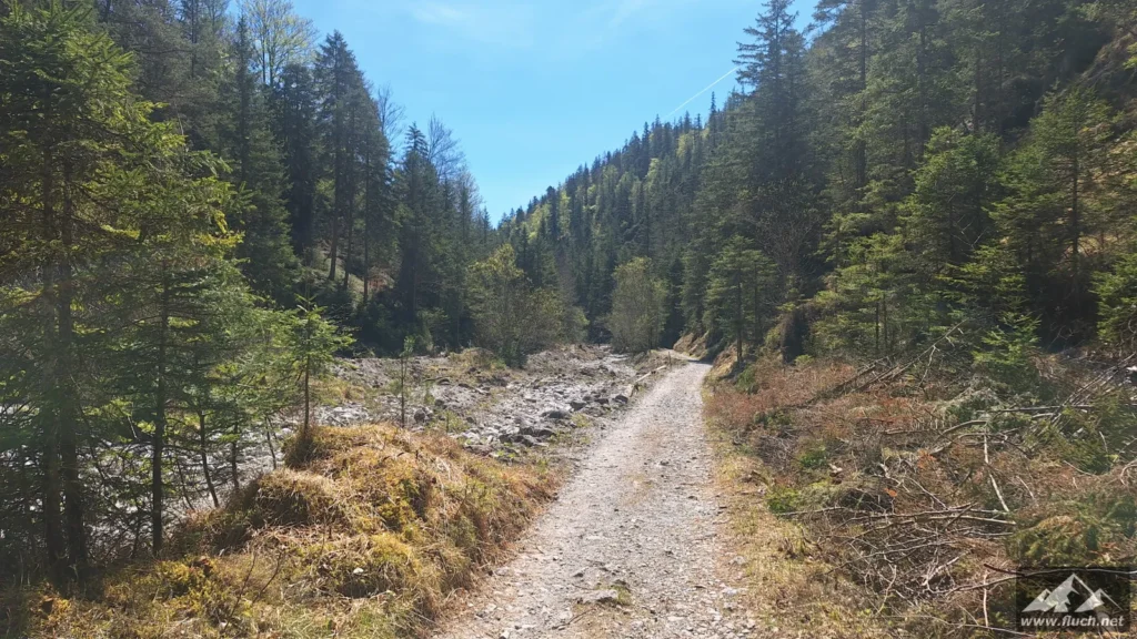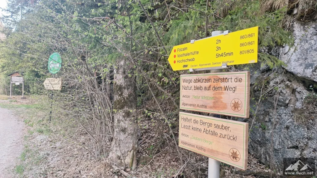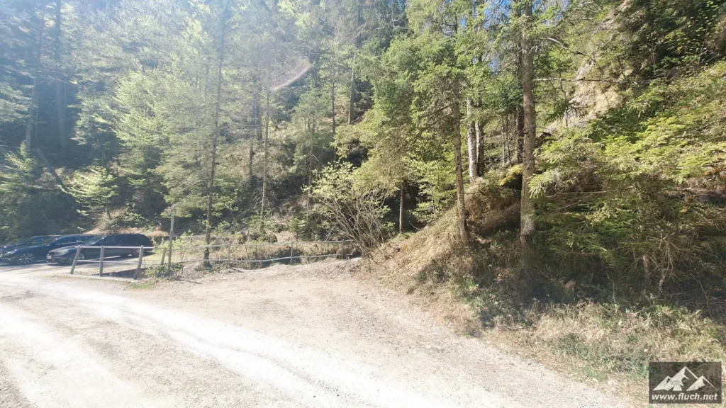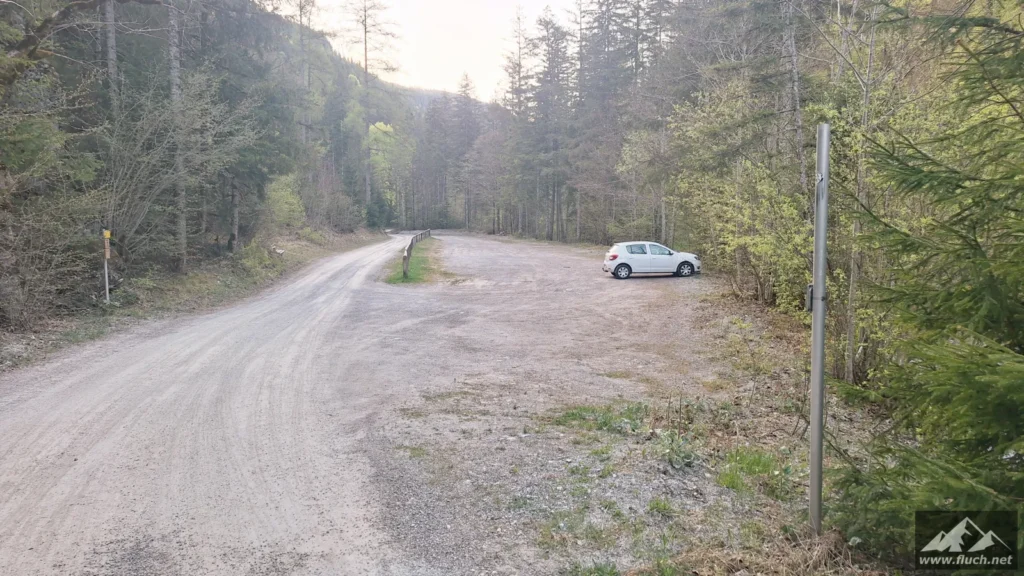 Start war um 6:30 Uhr am gebührenpflichtigen Parkplatz in der Fölz (ca. 800m, derzeit € 4,- Parkgebühr), an diesem Tag war ich noch alleine dort. Entlang der Forststraße ging es dann ein Stück hinein in Richtung Klamm, bei einer Brücke davor beginnt der unscheinbare Steig.