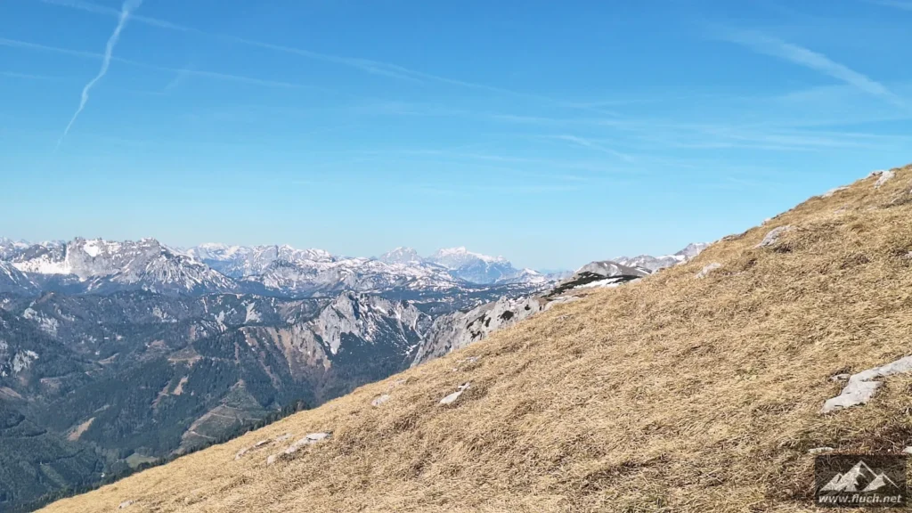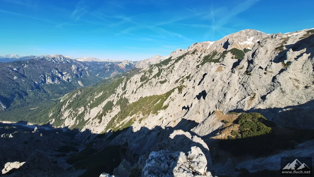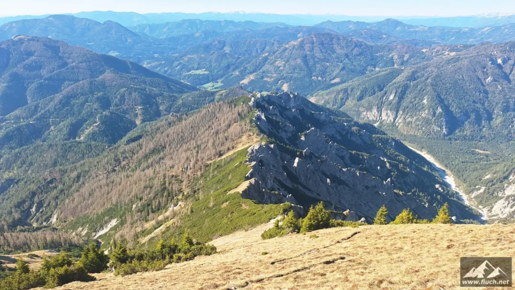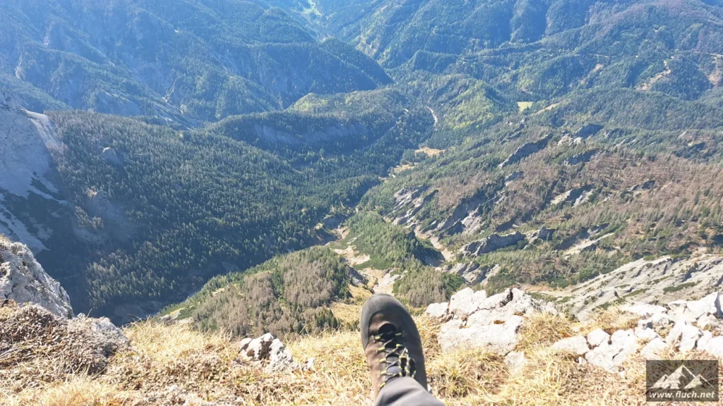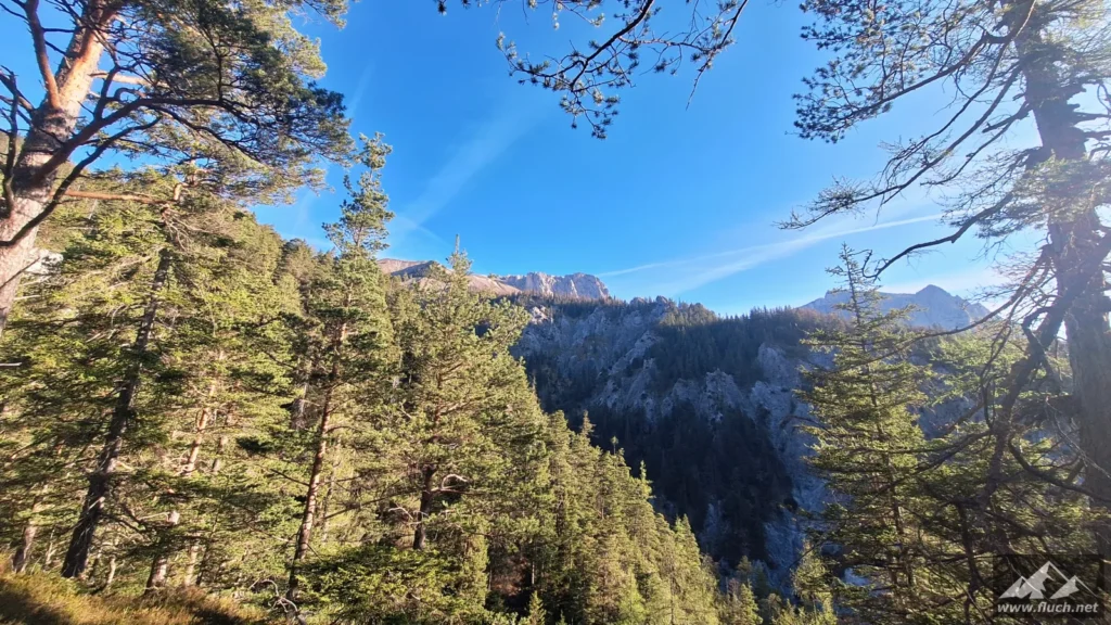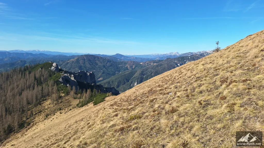 Hinter der Jagdhütte geht der Weg weiter steil hinauf in Richtung Brennsattel, dort mündet auch der Weg vom Leiternsteig kommend ein. Hier gibt es tolle Tief- und Ausblicke zur Karlschütt und in das Hochschwabgebiet.