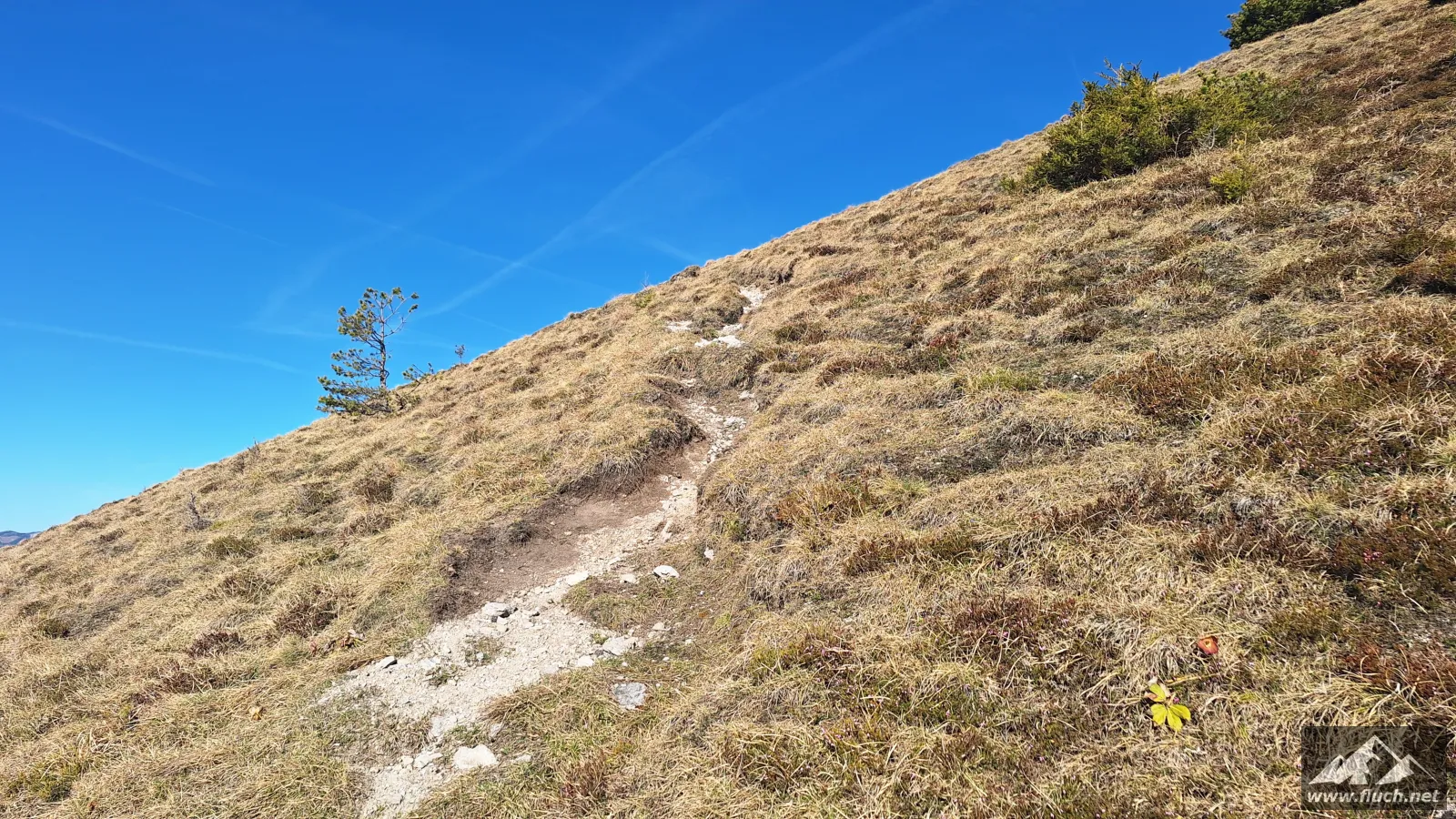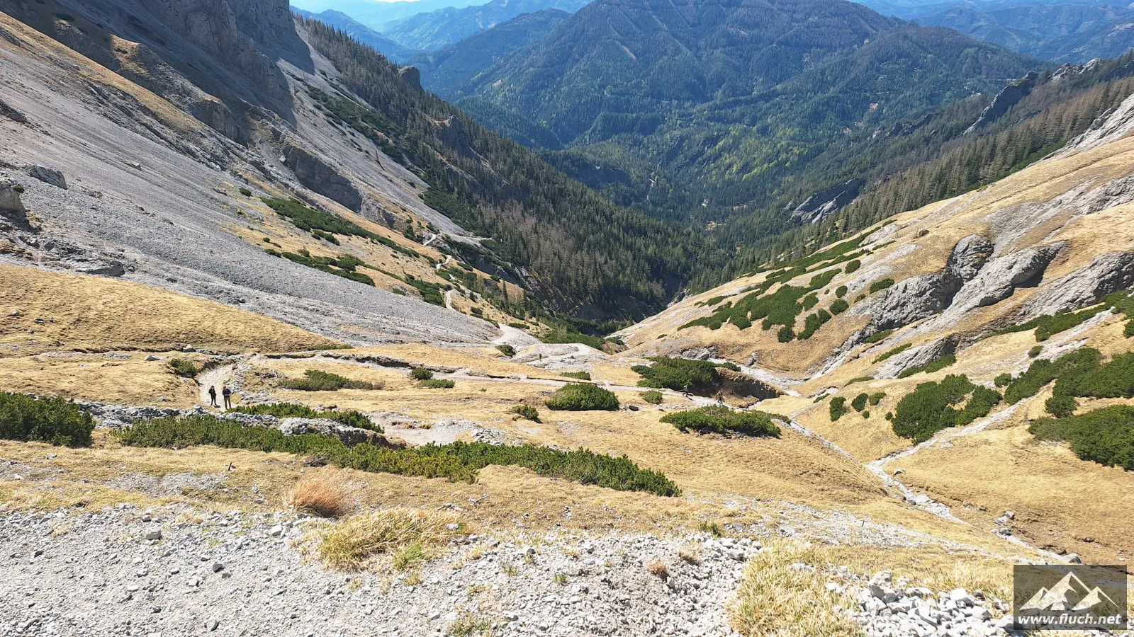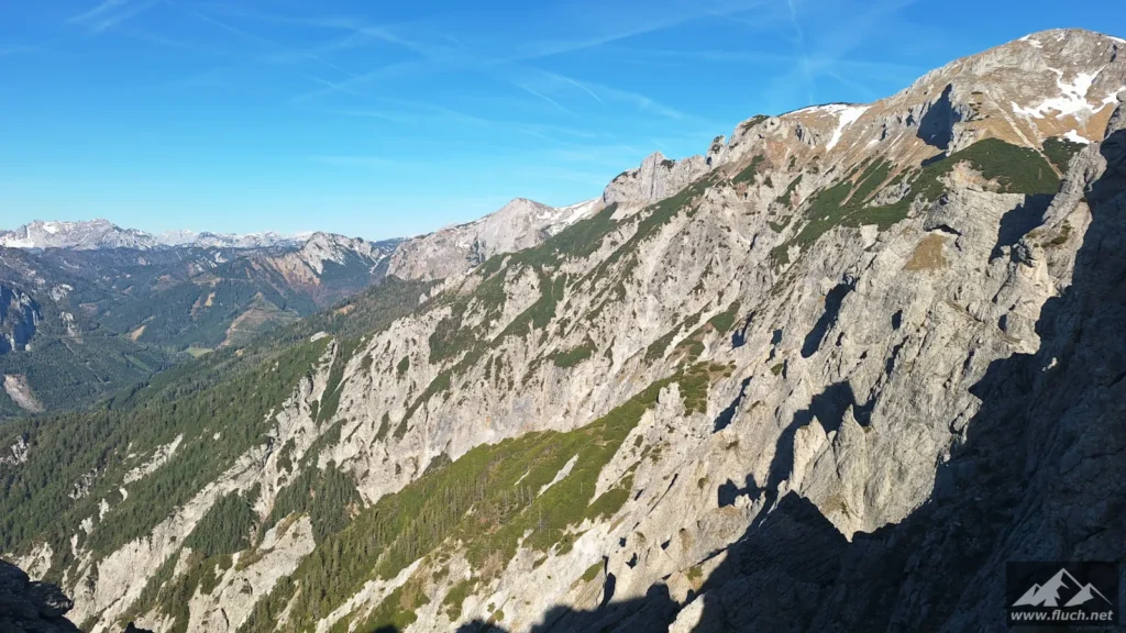Hinter der Jagdhütte geht der Weg weiter steil hinauf in Richtung Brennsattel, dort mündet auch der Weg vom Leiternsteig kommend ein. Hier gibt es tolle Tief- und Ausblicke zur Karlschütt und in das Hochschwabgebiet.