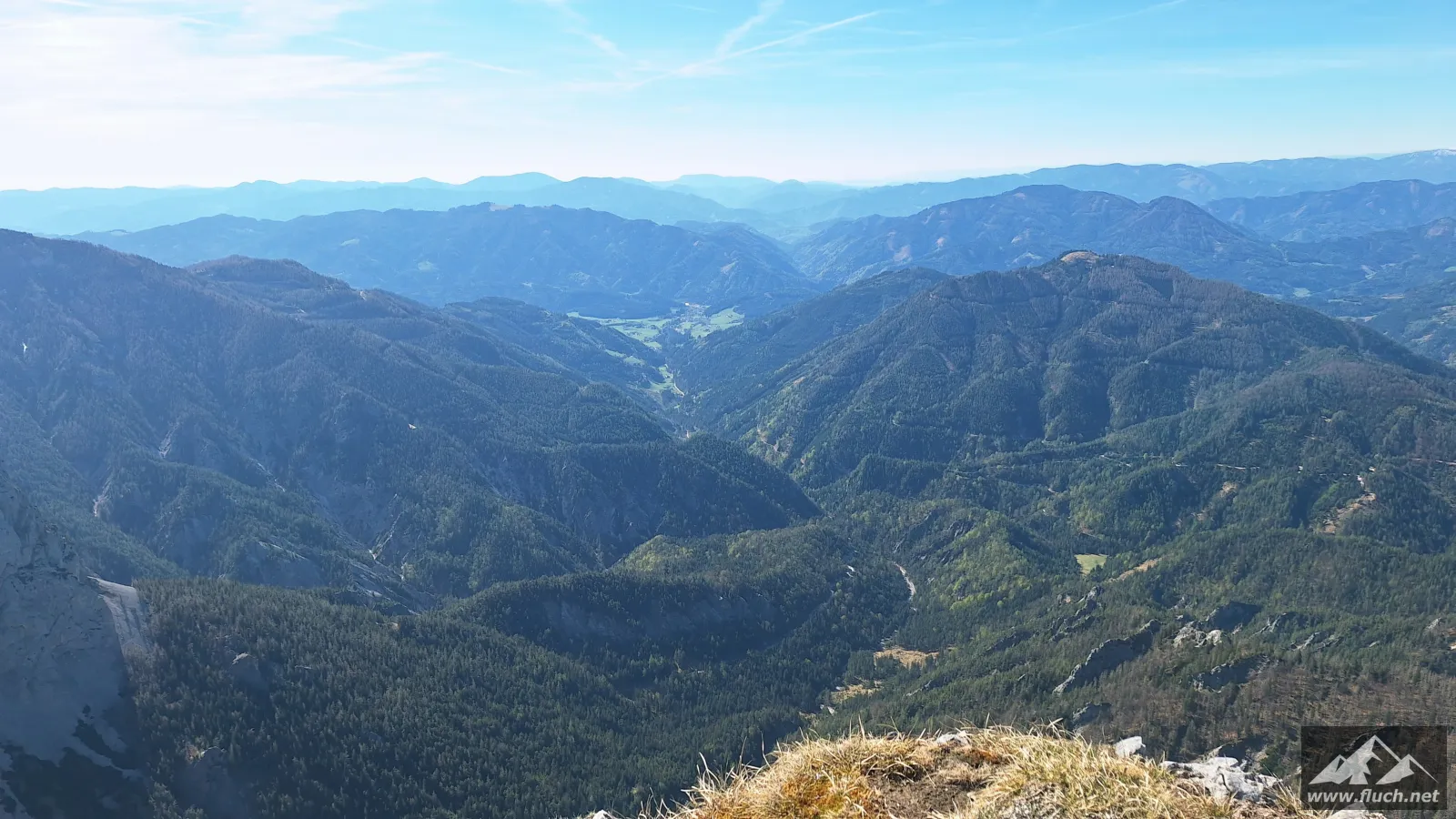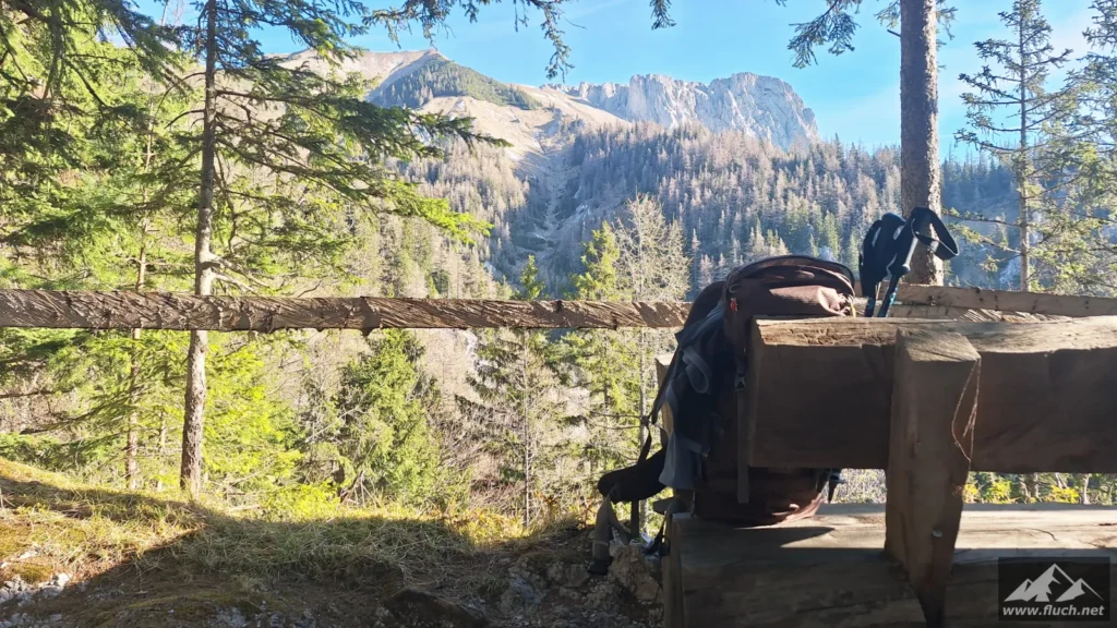 Durch den Wald ging es dann teilweise steil hinauf bis zu einer Jagdhütte (ca. 1.240m) mit einem Rastbankerl das eine tolle Aussicht bietet. Das habe ich natürlich für eine erste Pause genutzt und mich auf den folgenden, sehr steilen Wegabschnitt vorbereitet.