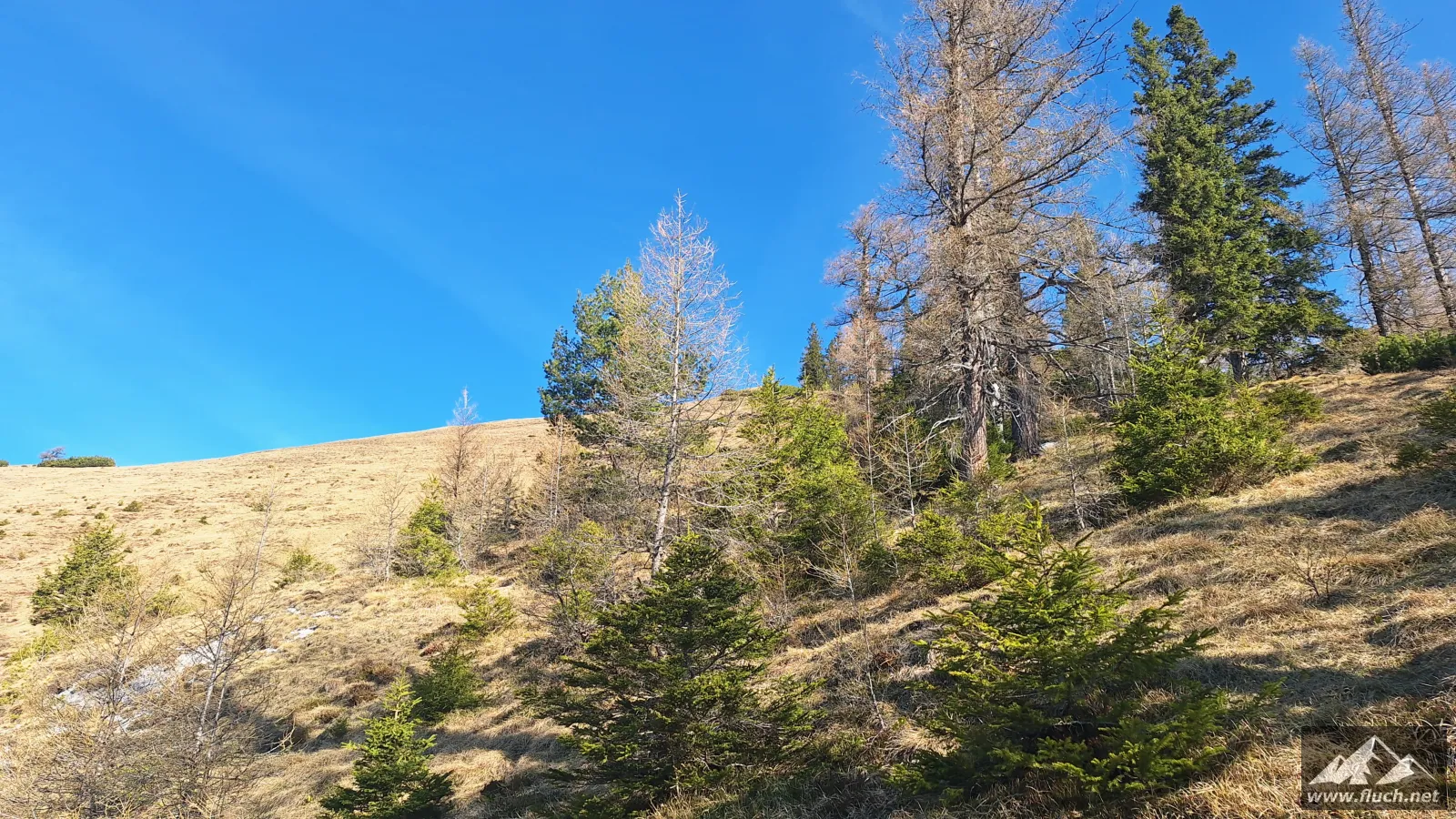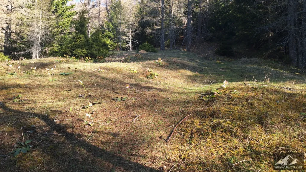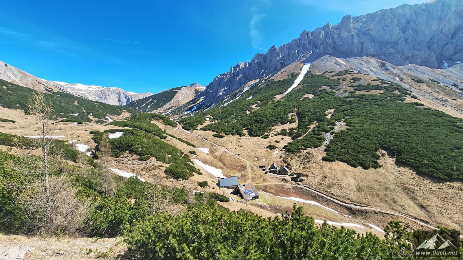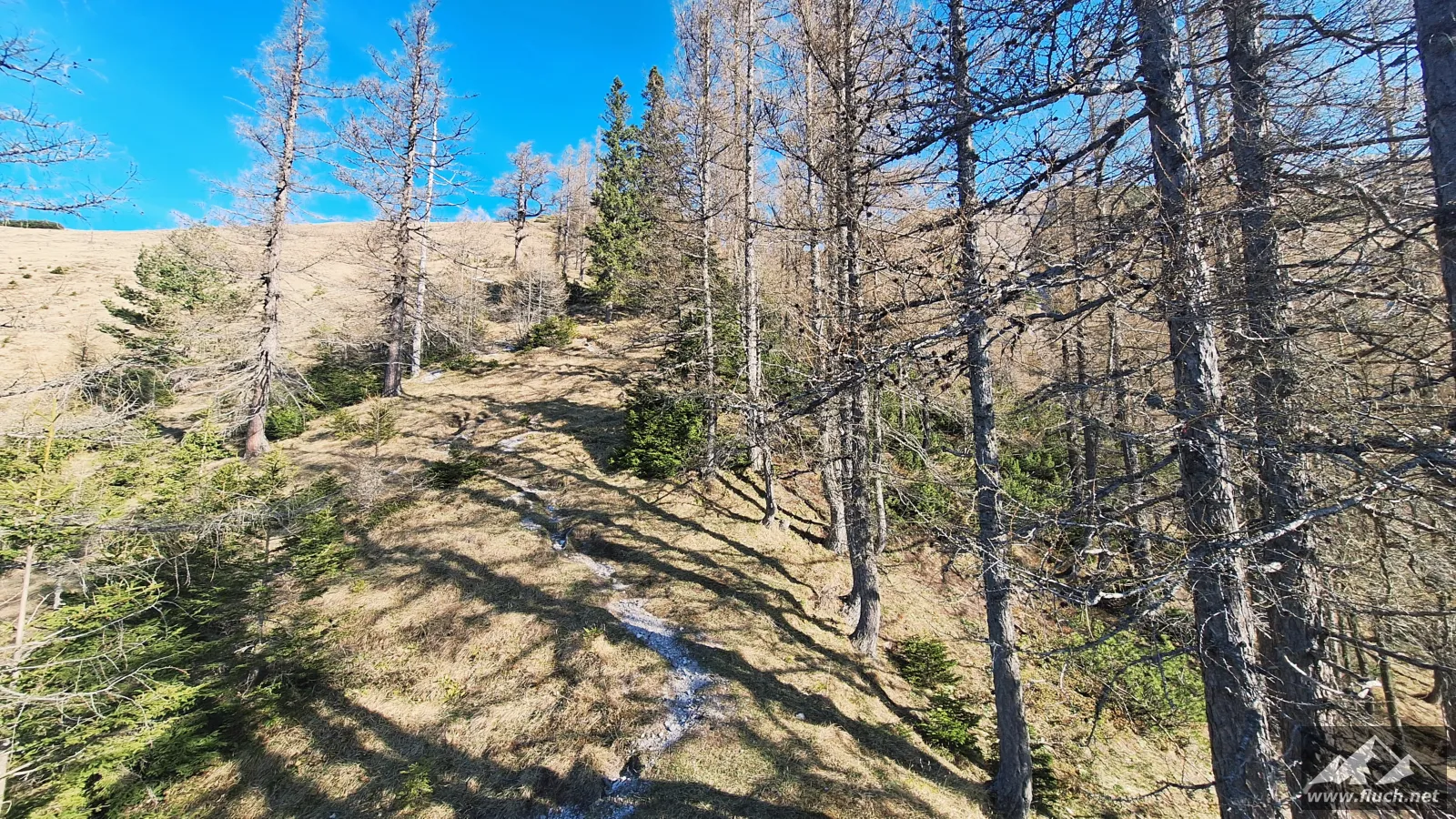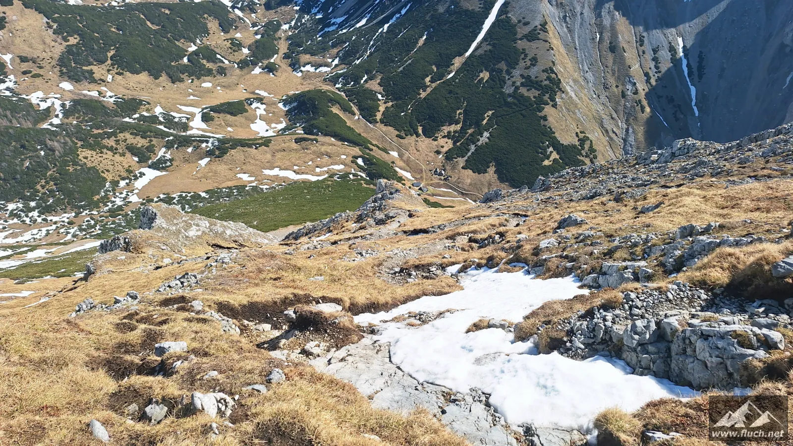 Nach der Gipfelrast entschied ich mich dann für den Abstieg zur Fölzalm (1.472m), ich war mir beim Aufstieg nicht sicher ob der steile Weg hinunter schon begehbar ist, aber nach einem Blick von oben stellte sich heraus das der gesamte Weg schneefrei war.