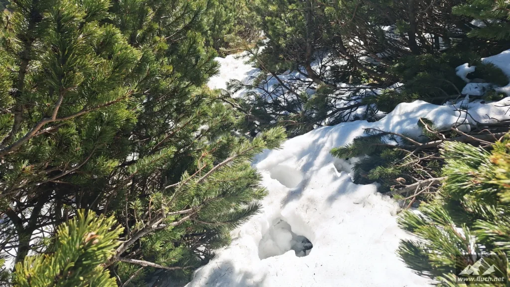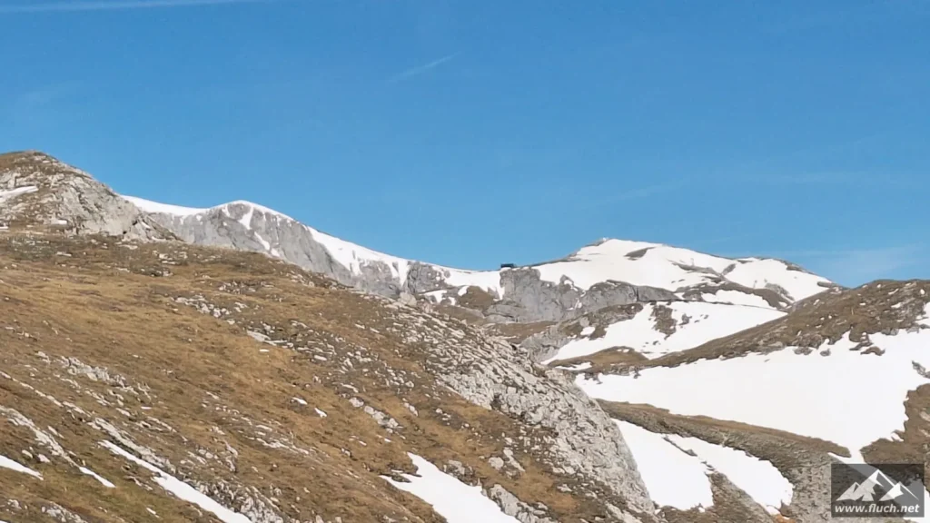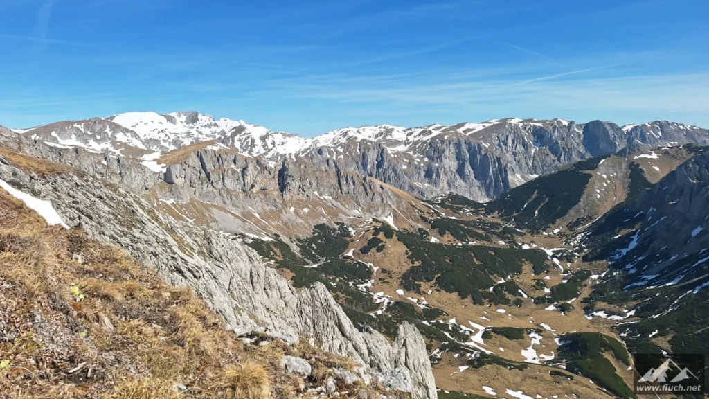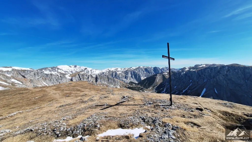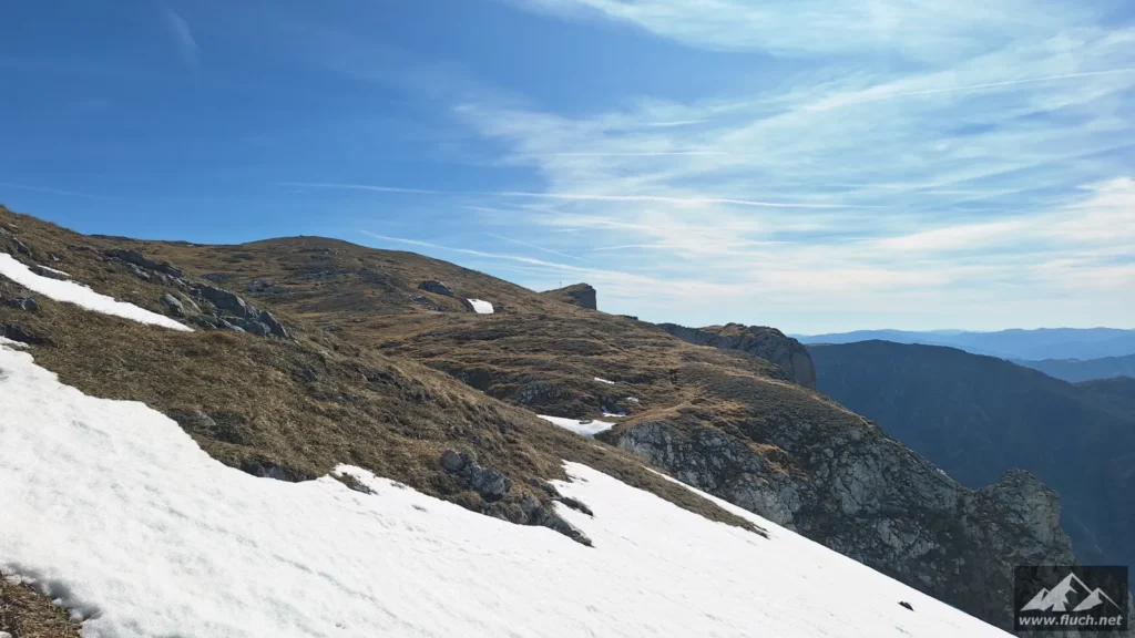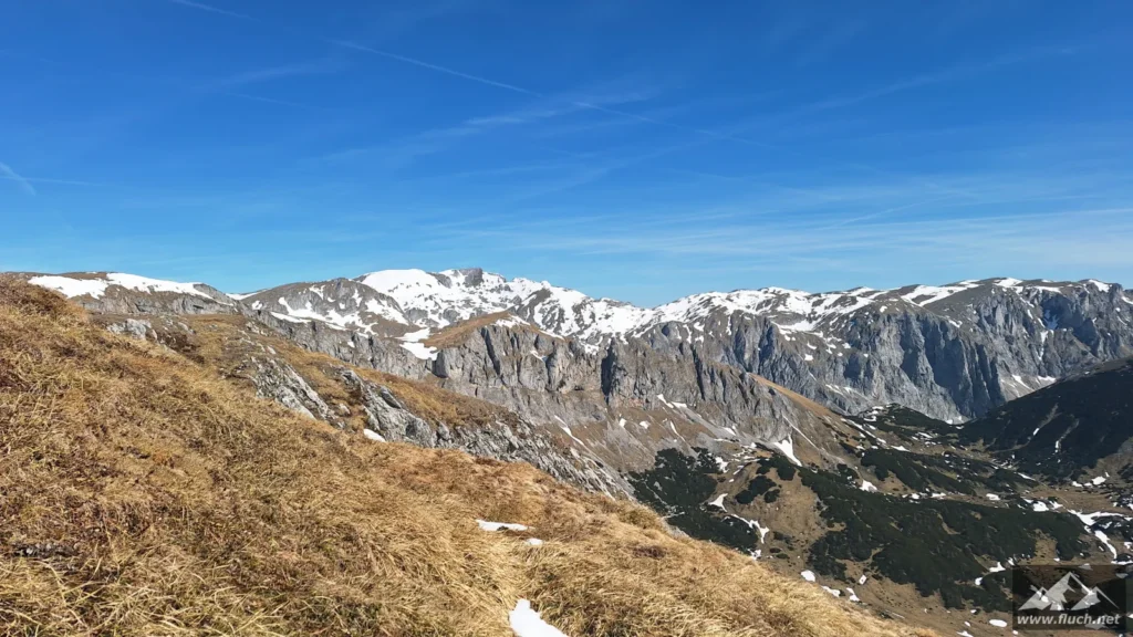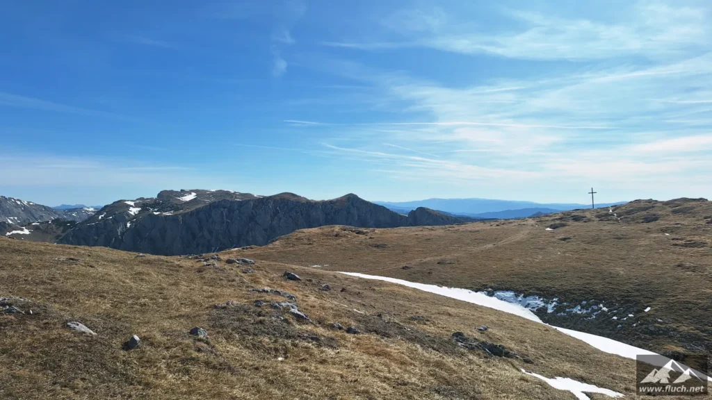Schließlich ging es noch über ein Schneefeld hinüber zum Gipfel des Fölzstein (1.946m) mit dem traumhaften Panorama. In einer windgeschützten Mulde machte ich hier eine wohlverdiente Pause in der Sonne.