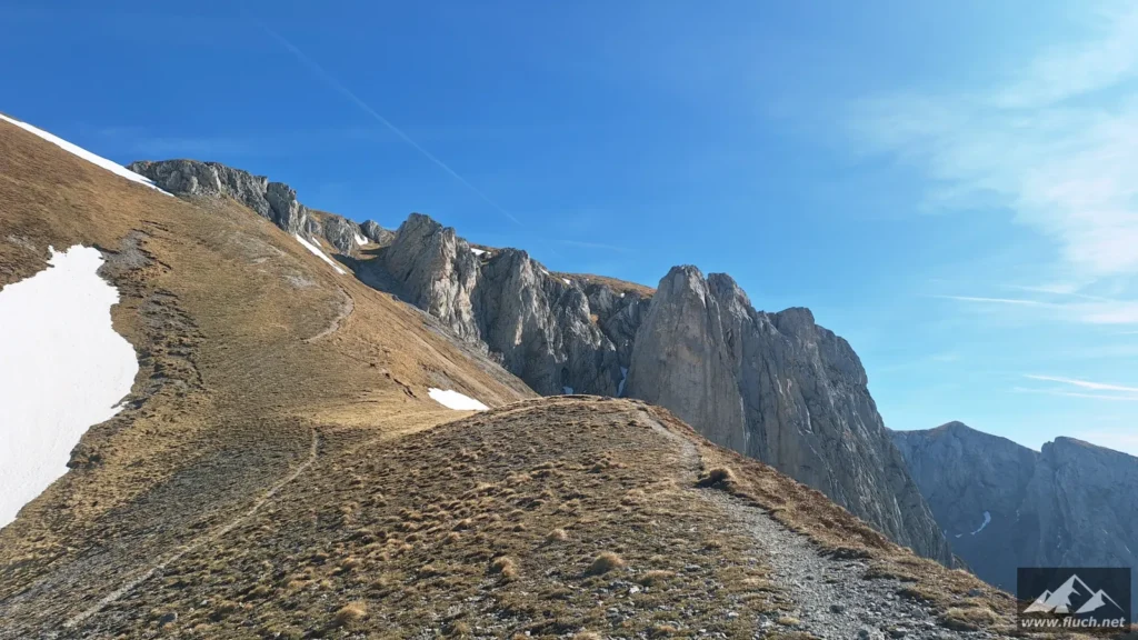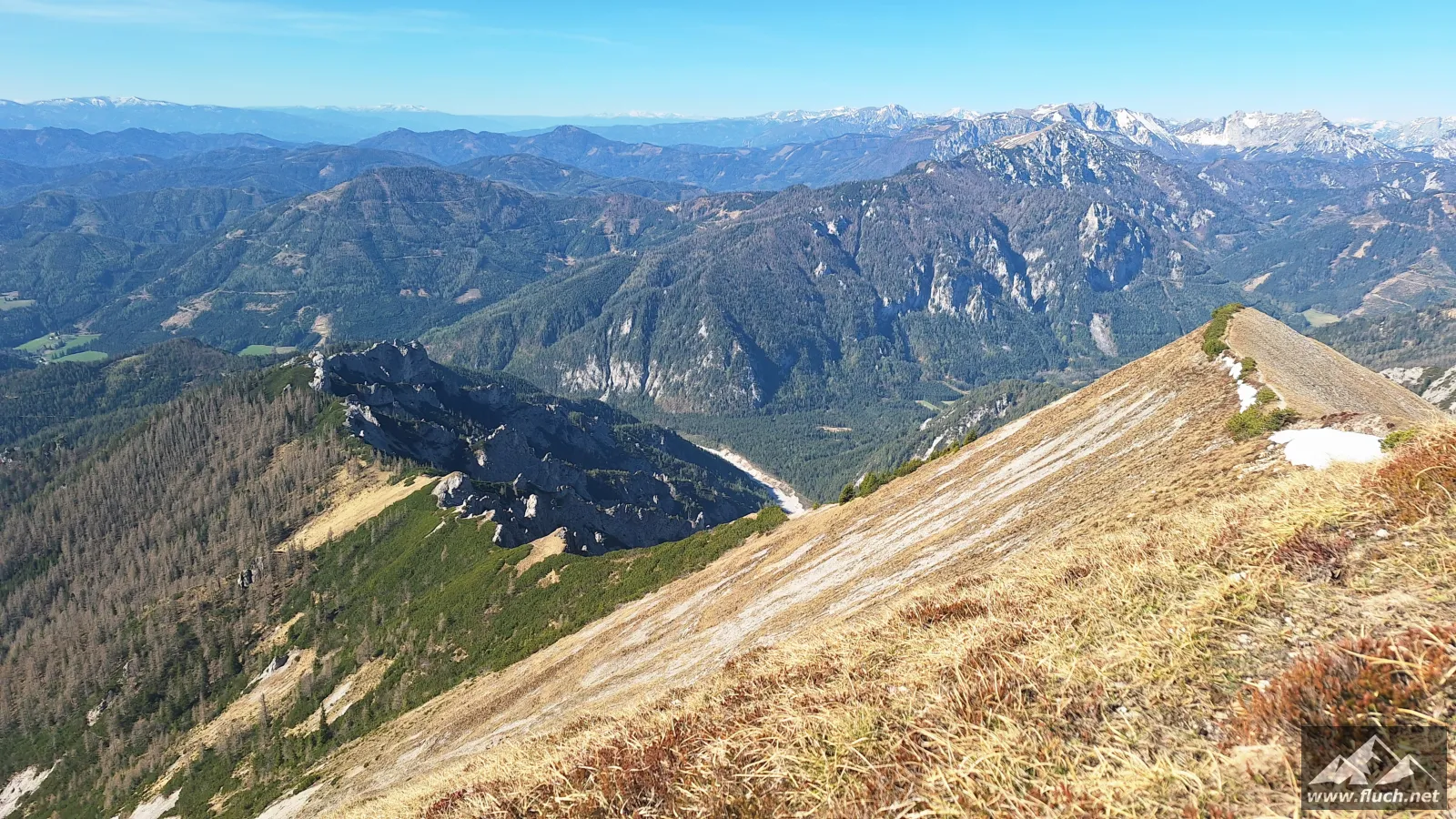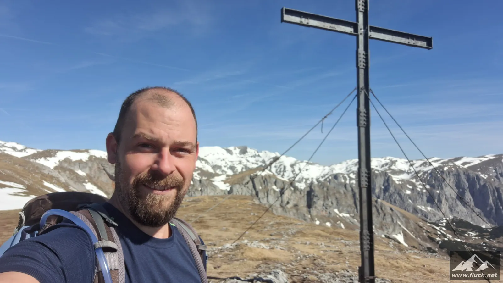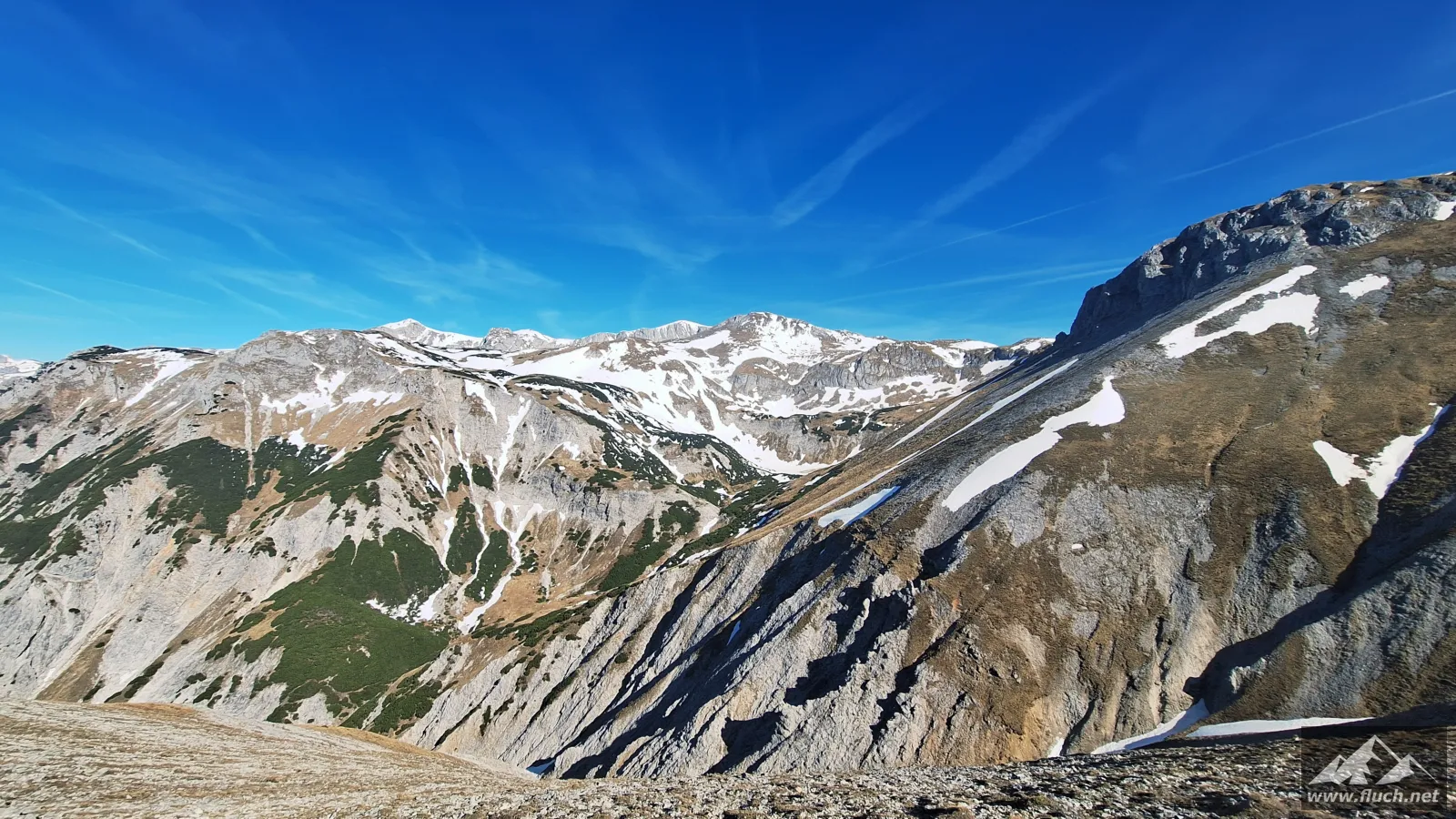 Schließlich ging es noch über ein Schneefeld hinüber zum Gipfel des Fölzstein (1.946m) mit dem traumhaften Panorama. In einer windgeschützten Mulde machte ich hier eine wohlverdiente Pause in der Sonne.
