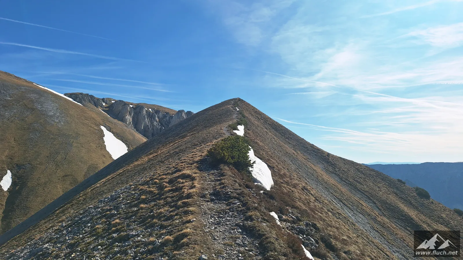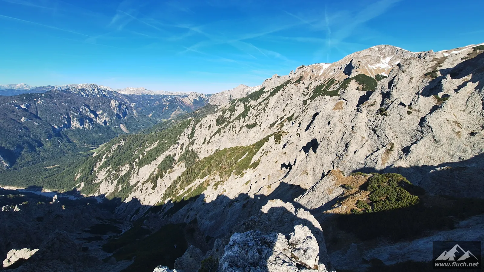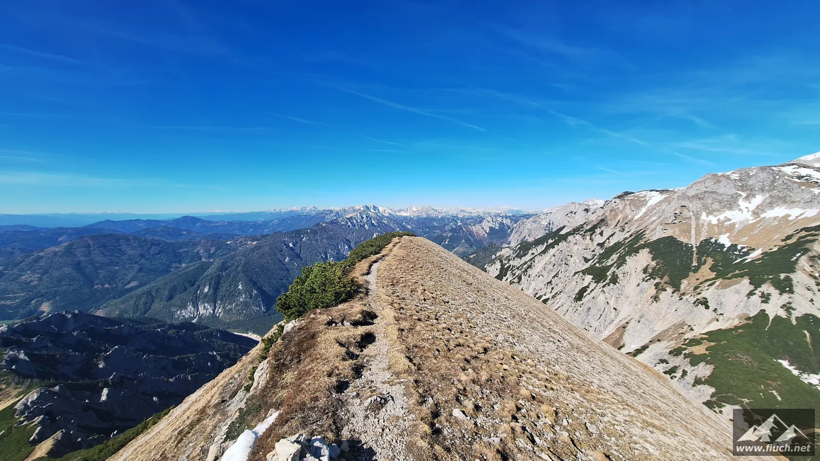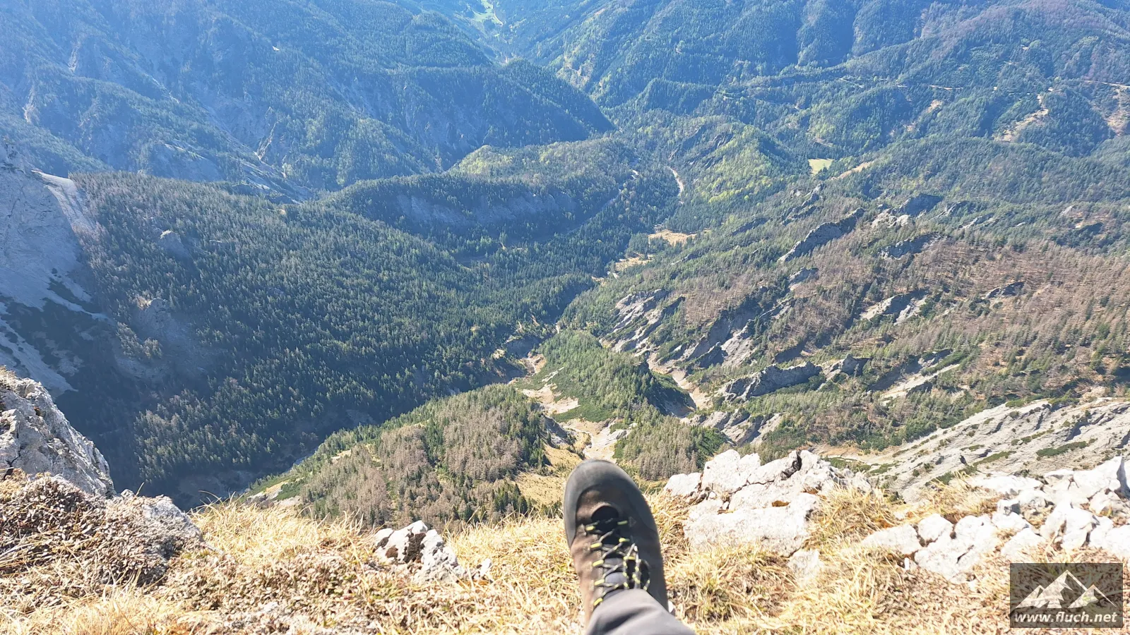 Schließlich ging es noch über ein Schneefeld hinüber zum Gipfel des Fölzstein (1.946m) mit dem traumhaften Panorama. In einer windgeschützten Mulde machte ich hier eine wohlverdiente Pause in der Sonne.