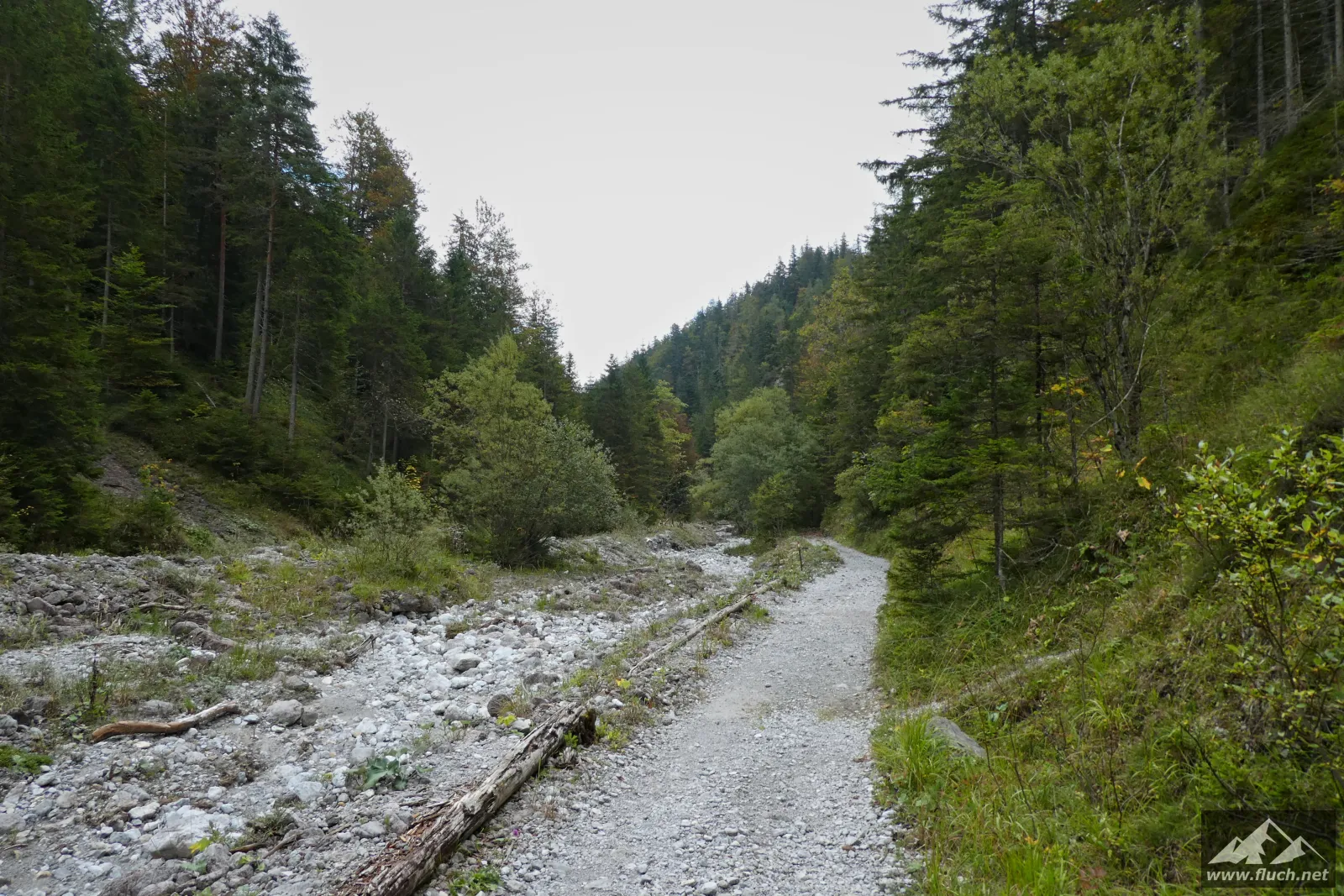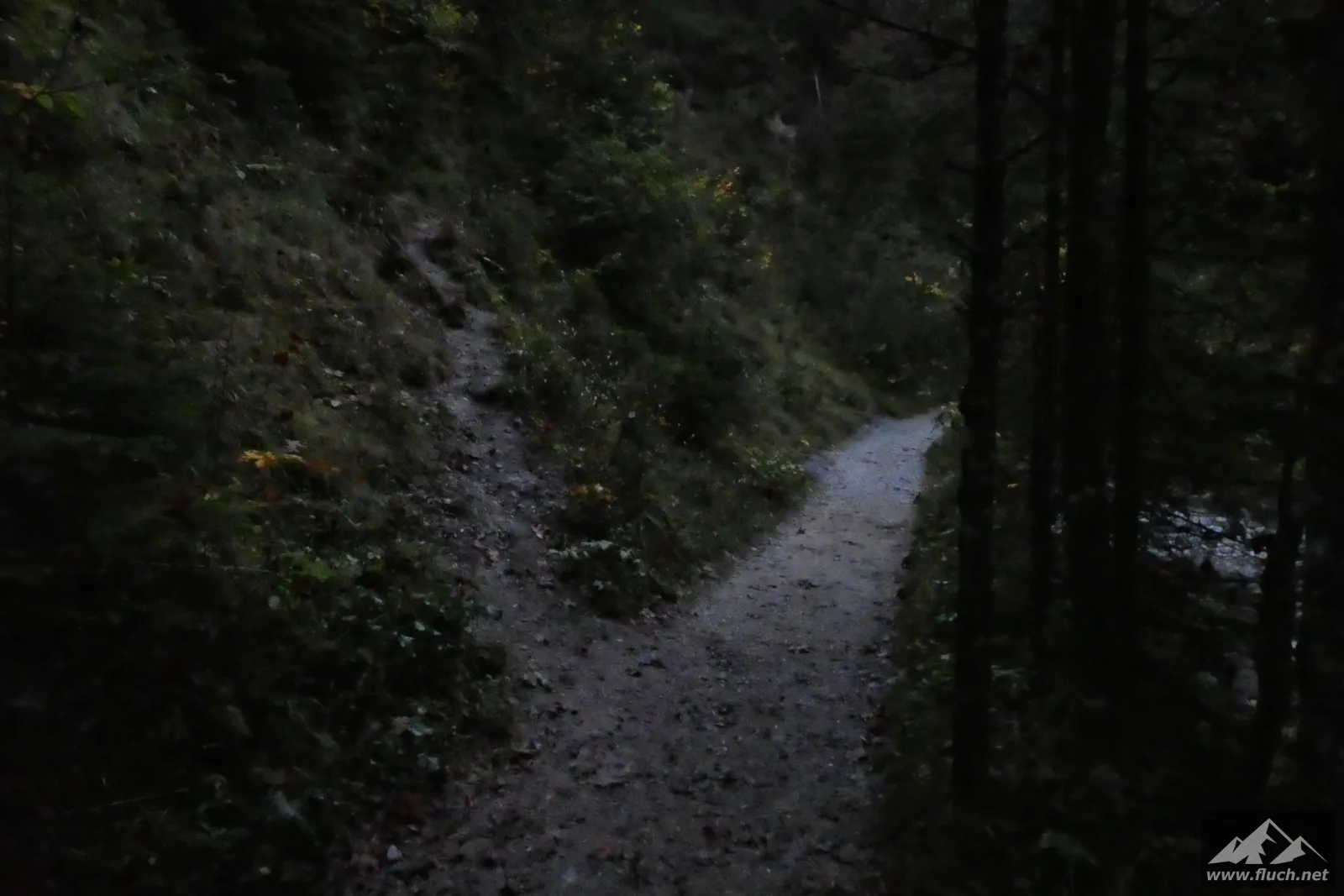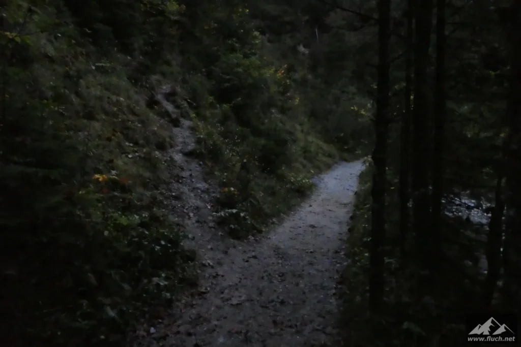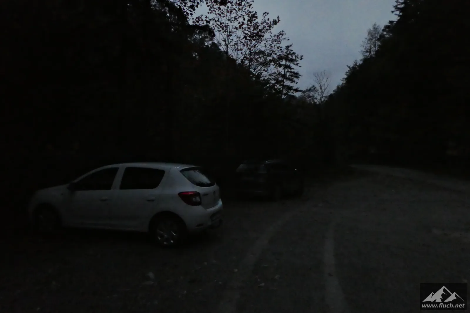 Am Ausgangspunkt der Wanderung am hinteren Parkplatz in der Fölz (ca. 765m) war es um 6:30 Uhr heute noch sehr dunkel, man merkt schon das die Tage wesentlich kürzer werden. Zuerst ging es entlang der Straße bis zur Abzweigung zur Klamm und dem Ghf. Schwabenbartl, ich hielt mich links und ging weiter über die Brücke durch die Klamm.