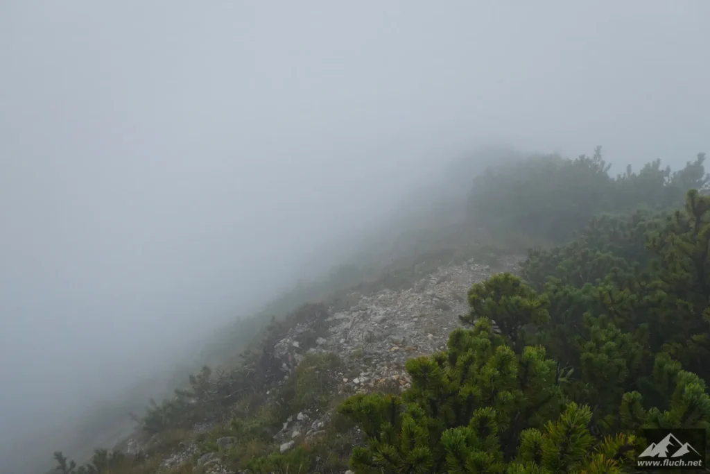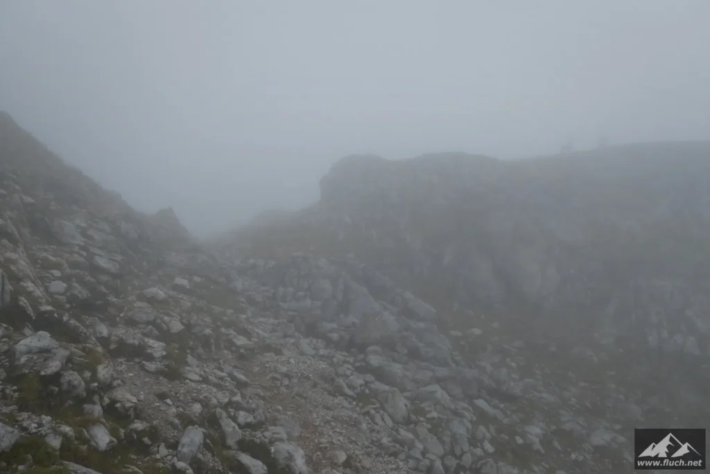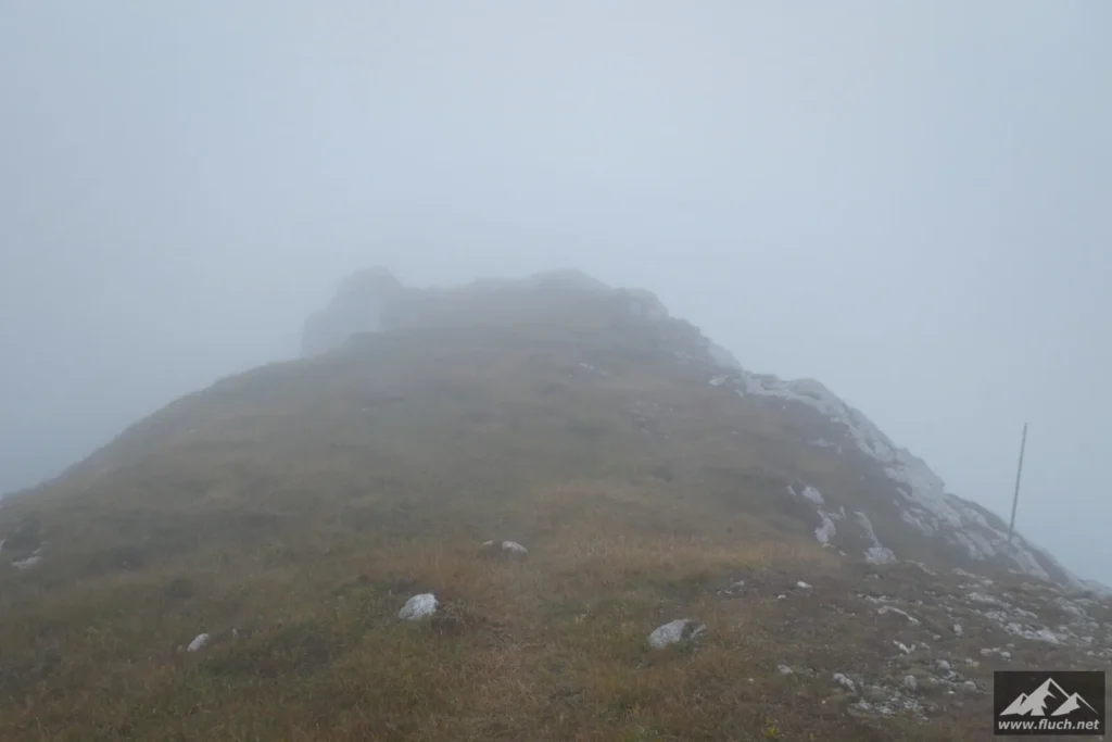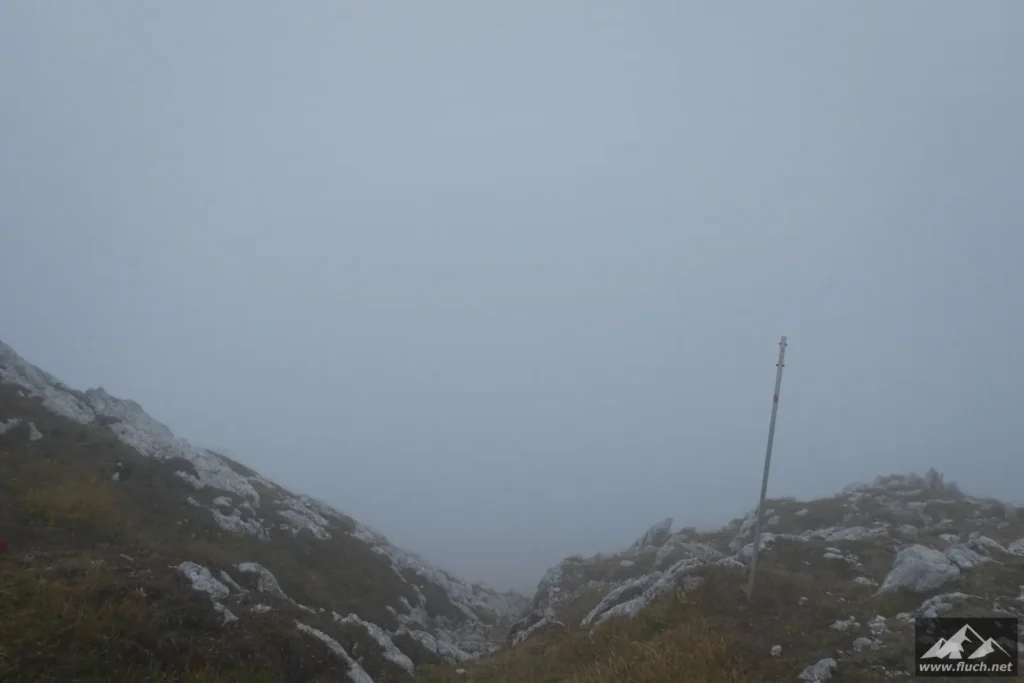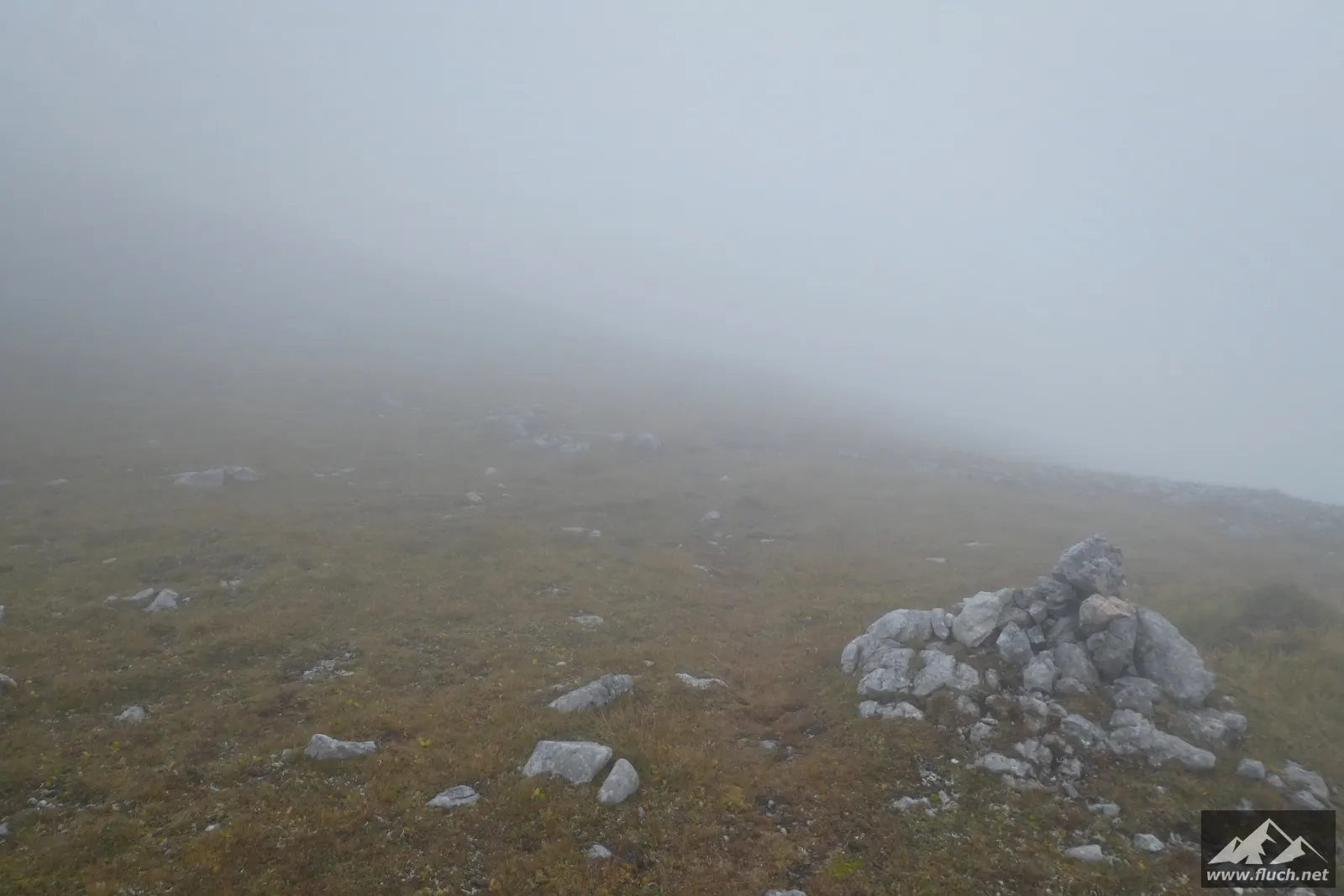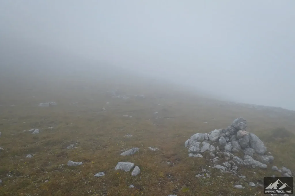 Anschließend ging es noch hinüber zum Fölzkogel (2.022m), wenigstens ein 2.000er musste sein an diesem Tag. Der Weg hinüber ist auch bei Nebel gut zu finden, an schönen Tagen gibt es hier eine tolle Aussicht zur Hochschwabsüdwand, das blieb mir heute aber auch verwehrt.