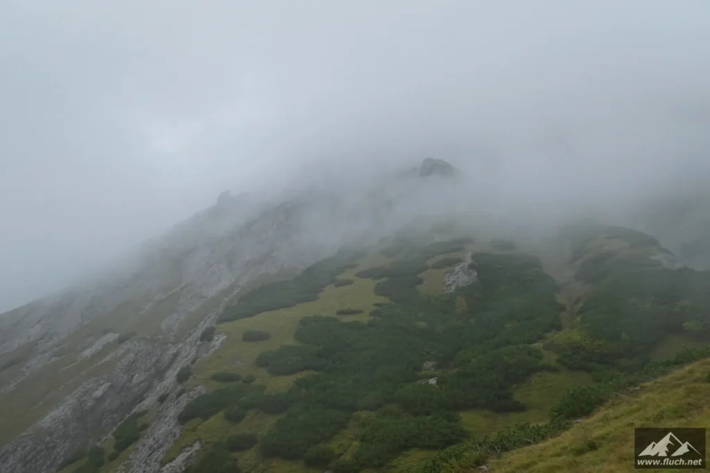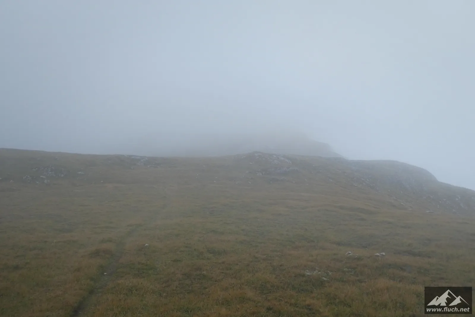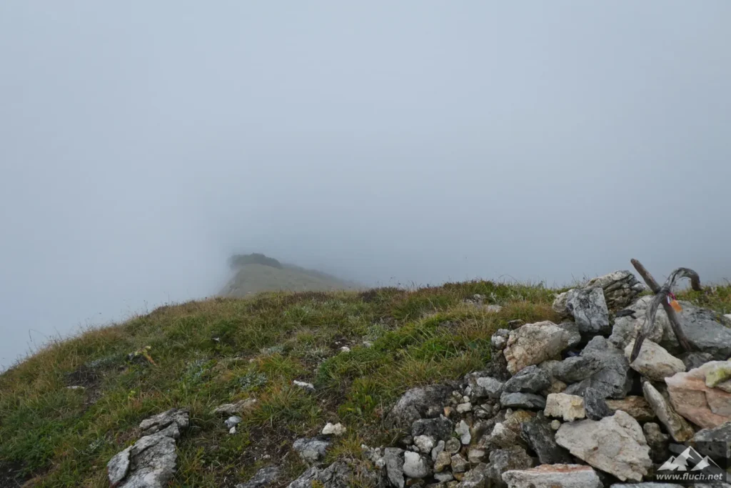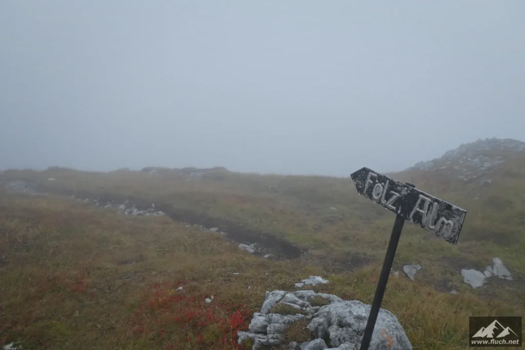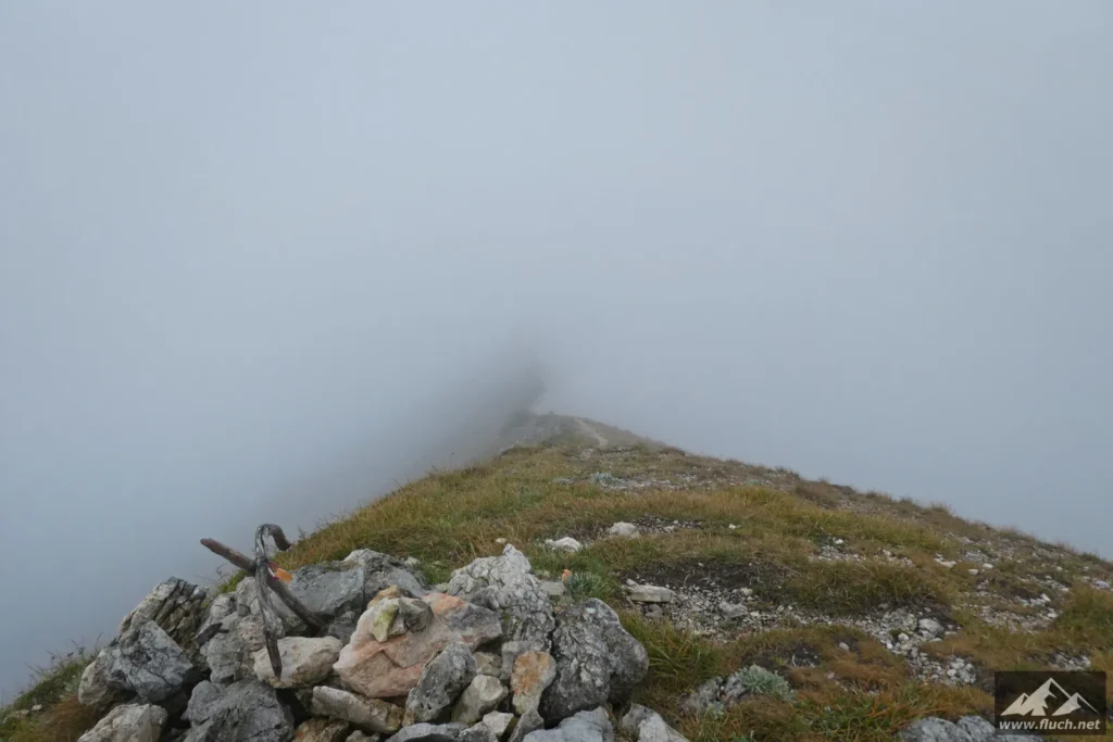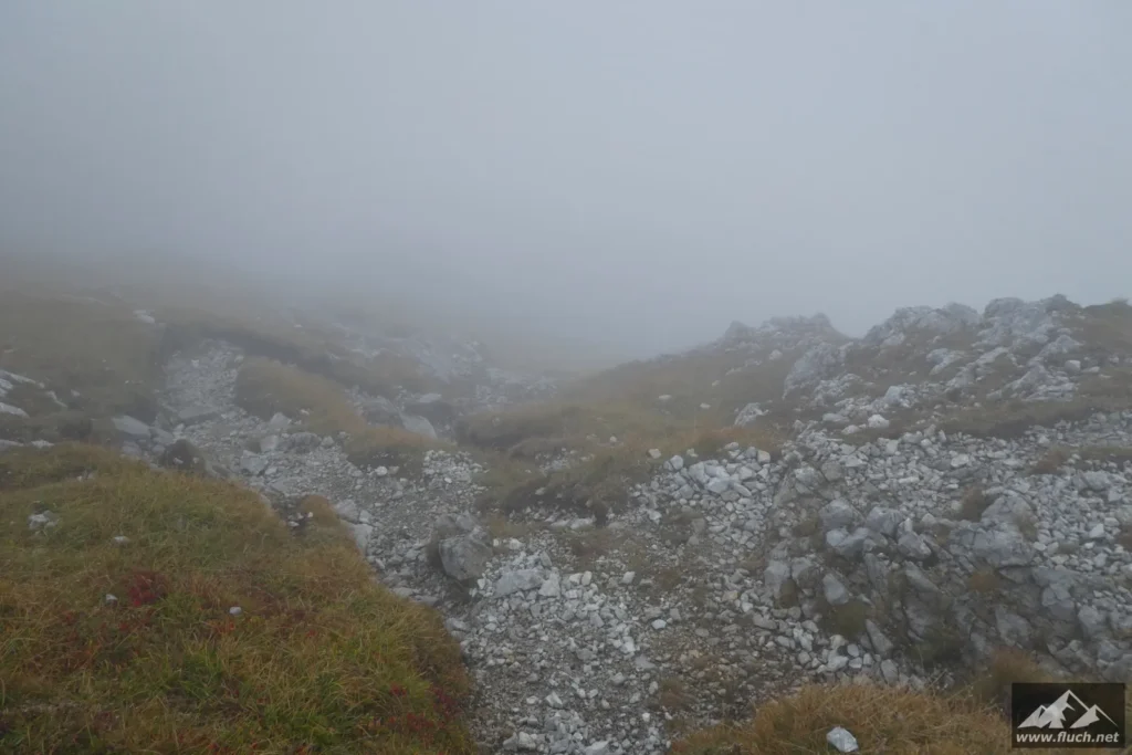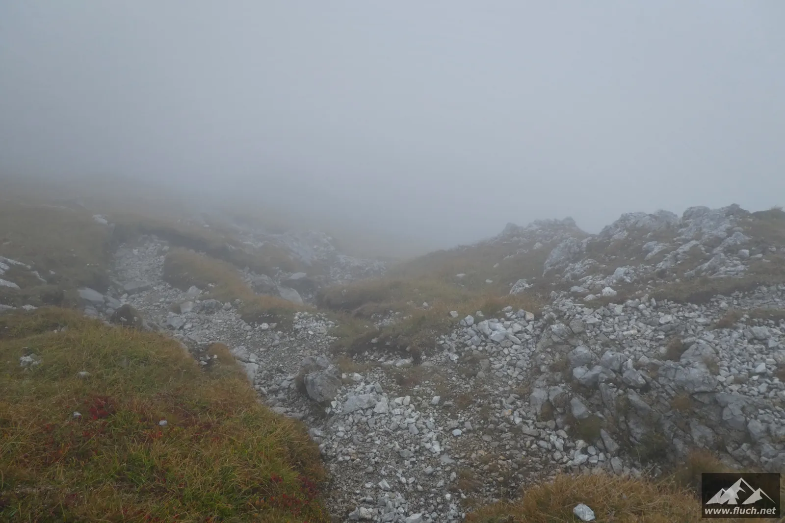 Anschließend ging es noch hinüber zum Fölzkogel (2.022m), wenigstens ein 2.000er musste sein an diesem Tag. Der Weg hinüber ist auch bei Nebel gut zu finden, an schönen Tagen gibt es hier eine tolle Aussicht zur Hochschwabsüdwand, das blieb mir heute aber auch verwehrt.