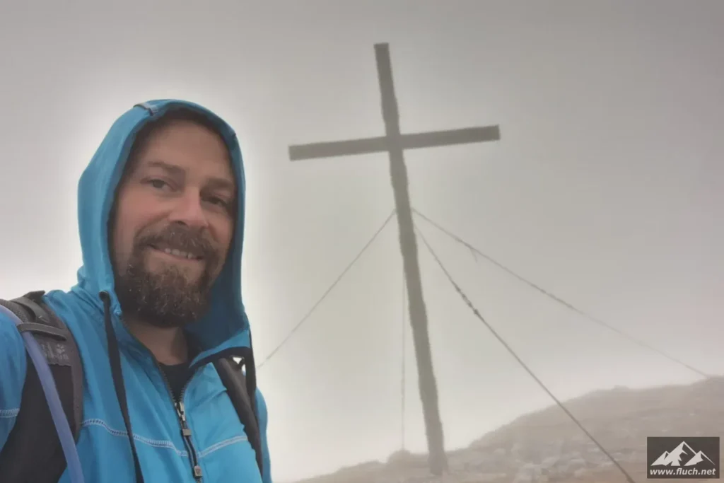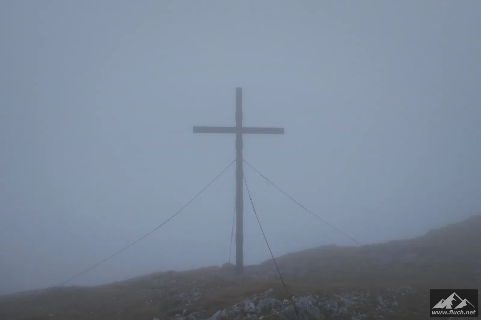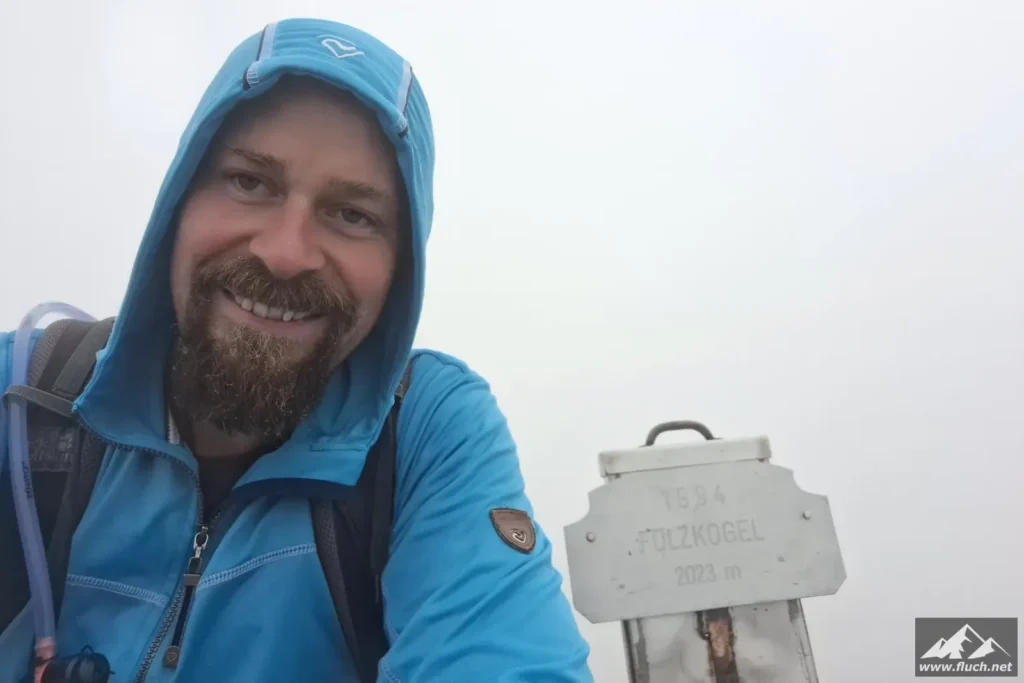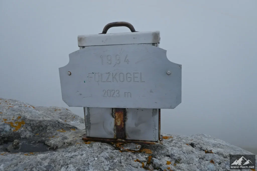 Auch am Gipfel des Fölzsteins (1.946m) war es komplett bewölkt, nebelig, eiskalt, der Wind pfiff ordentlich und die Sichtweite lag bei unglaublichen 10 Metern. Der Gipfelaufenthalt war also nur sehr kurz.