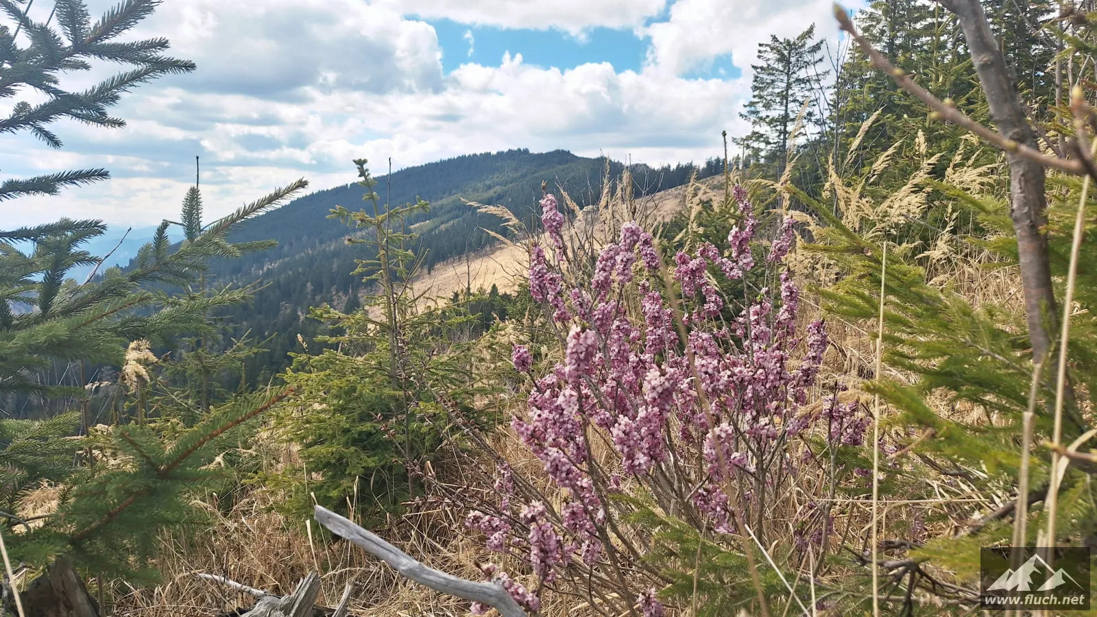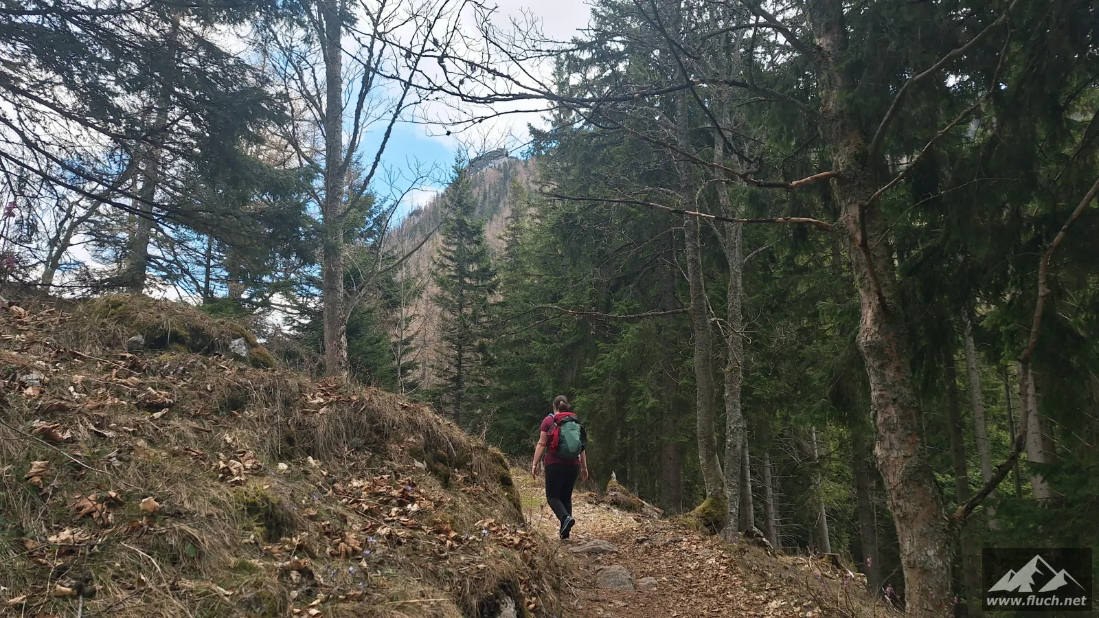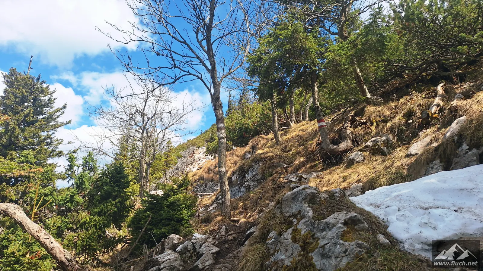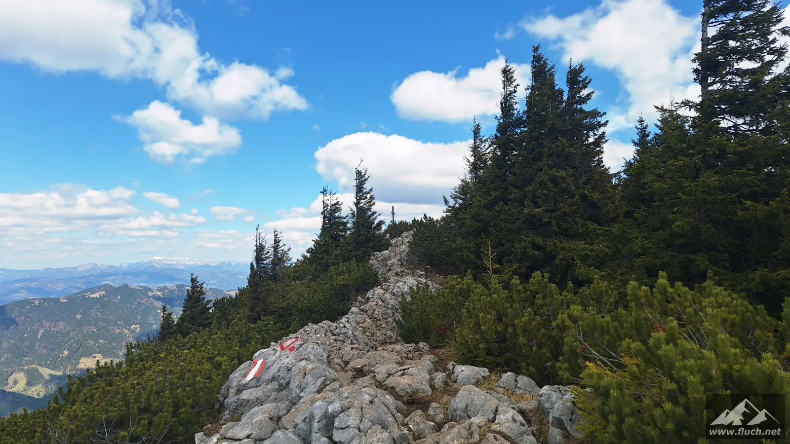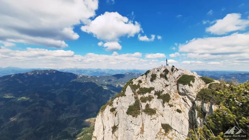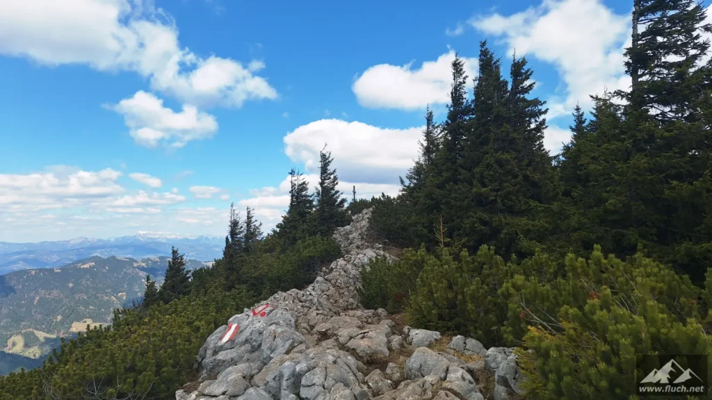Da es hier im Schatten noch sehr kalt war machen wir uns bald darauf wieder auf den Weg und folgen dem Wanderweg hinauf zum Gipfel des Hochlantsch (1.720m). Durch den Wald ging es etwas steiler auf breit ausgetretenen Pfaden hinauf, kurz vor dem Gipfel war dann noch eine kleine Latschengasse zu durchqueren ehe wir auch schon am Gipfel standen.