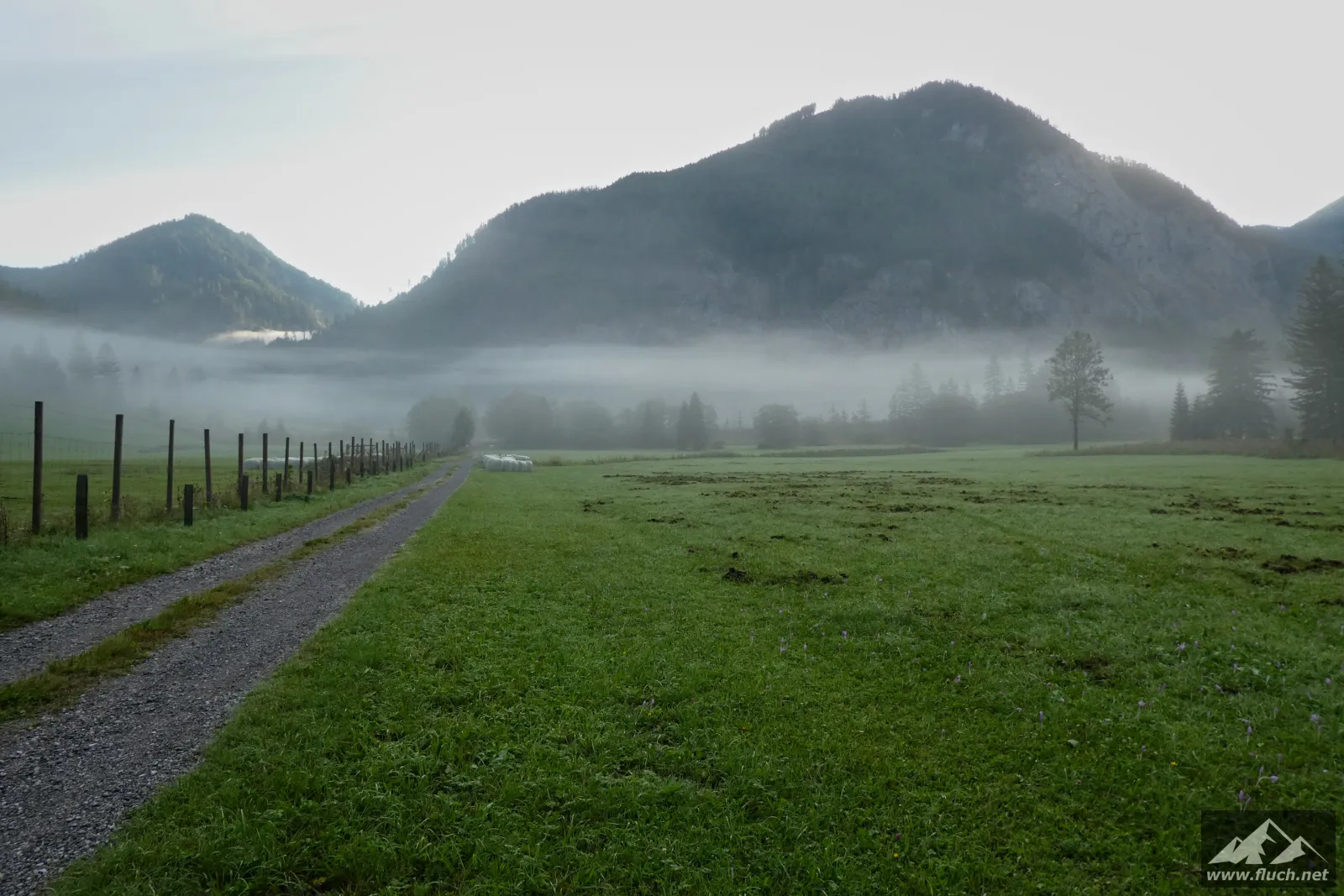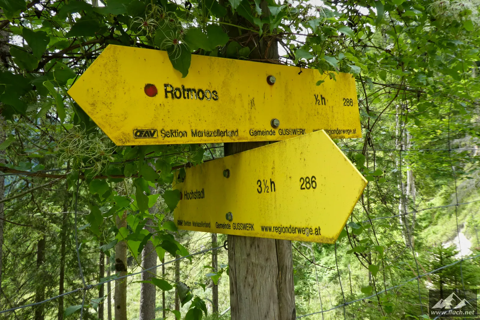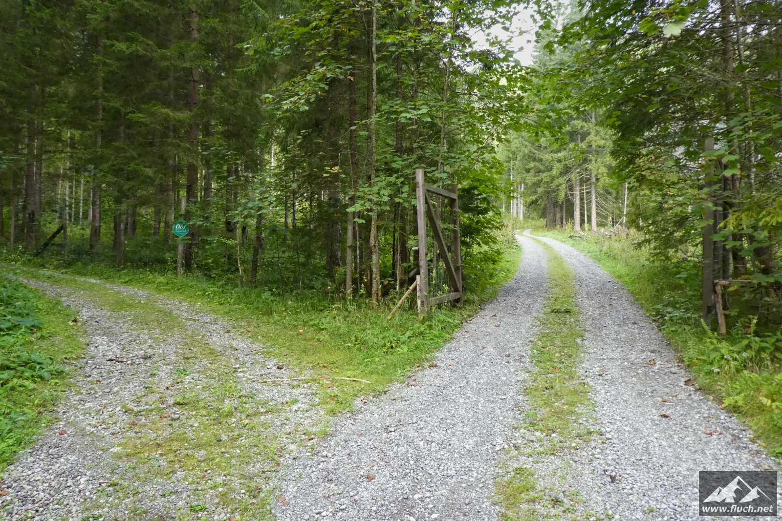 Los ging es um kurz nach 7:00 Uhr bei der großen Linde in Rotmoos (690m), der erste Wegabschnitt verläuft auf der Forststraße flach dahin bis zu einem Wildgatter. Hier geht es links am Tor vorbei weiter, nicht geradeaus.