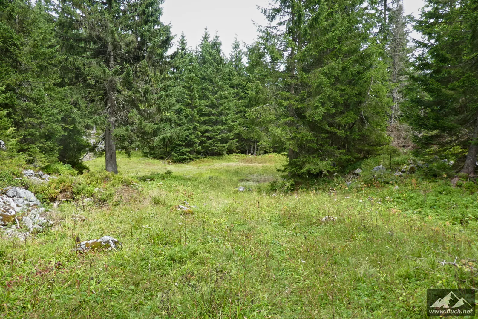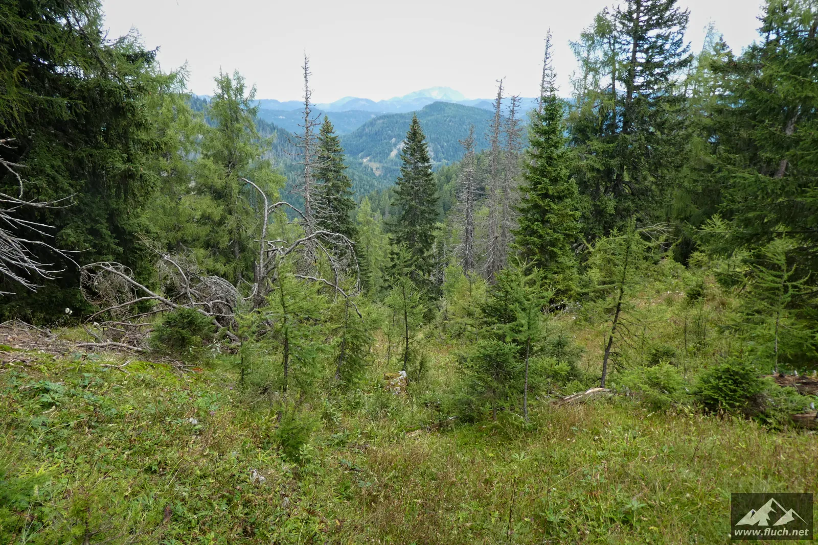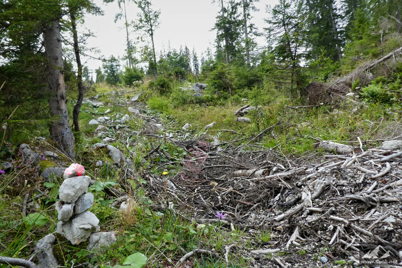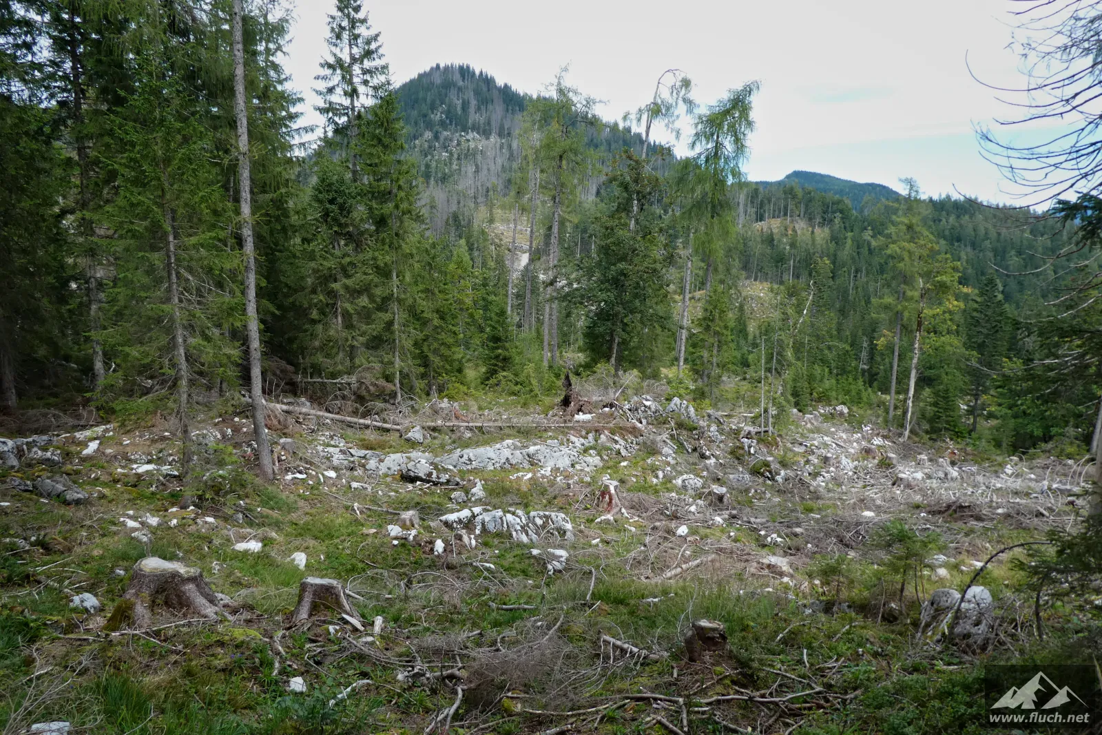 Rechts hinter dem Hochstand auf der Farnerwiese beginnt dann ein schöner Steig hinunter zur Forststraße. Von dort geht es dann zur Sacherlacke (1.250m) weiter, im unteren Bereich ist der Weg aber nicht mehr wirklich zu sehen, hier muss man sich einen eigenen Weg über den Holzschlag suchen.