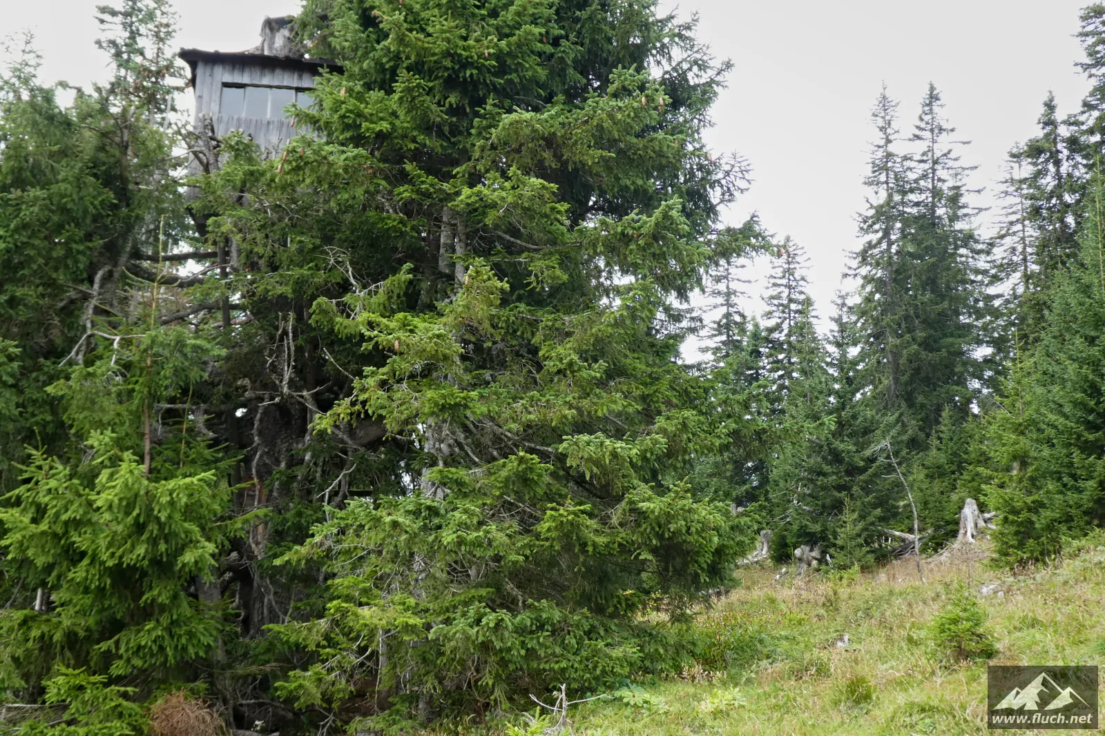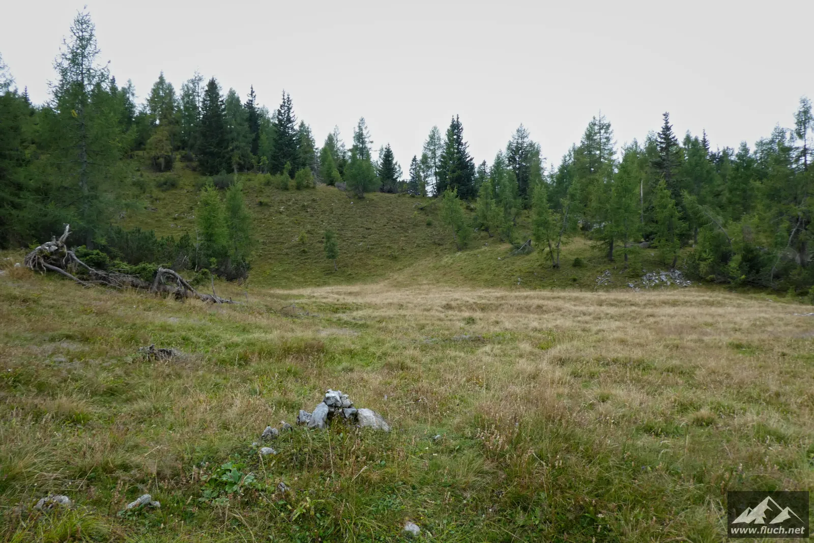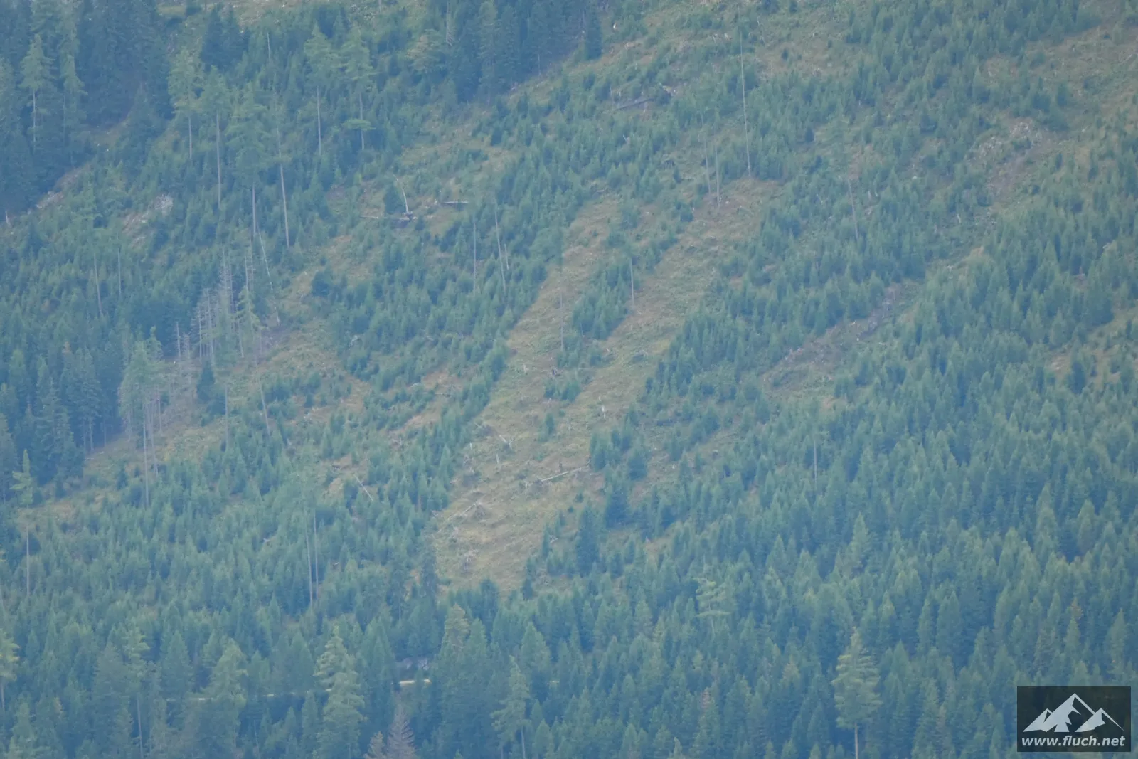 Rechts hinter dem Hochstand auf der Farnerwiese beginnt dann ein schöner Steig hinunter zur Forststraße. Von dort geht es dann zur Sacherlacke (1.250m) weiter, im unteren Bereich ist der Weg aber nicht mehr wirklich zu sehen, hier muss man sich einen eigenen Weg über den Holzschlag suchen.