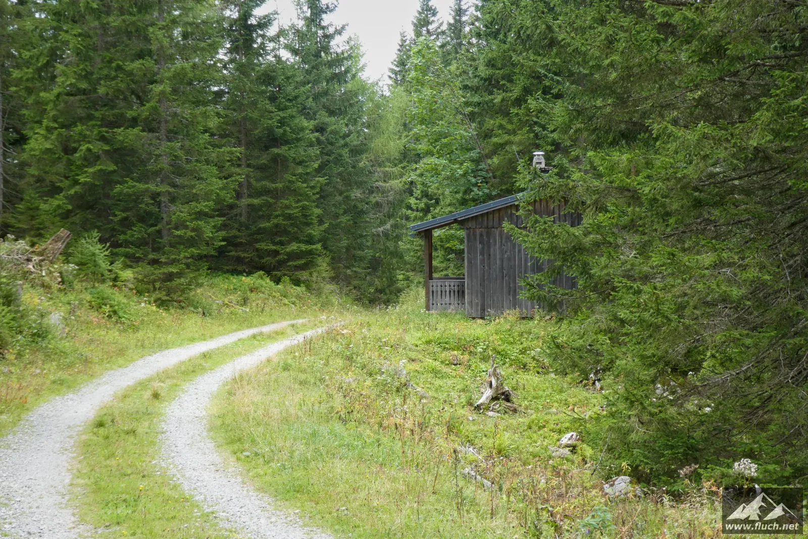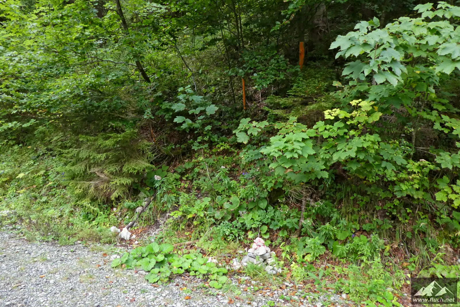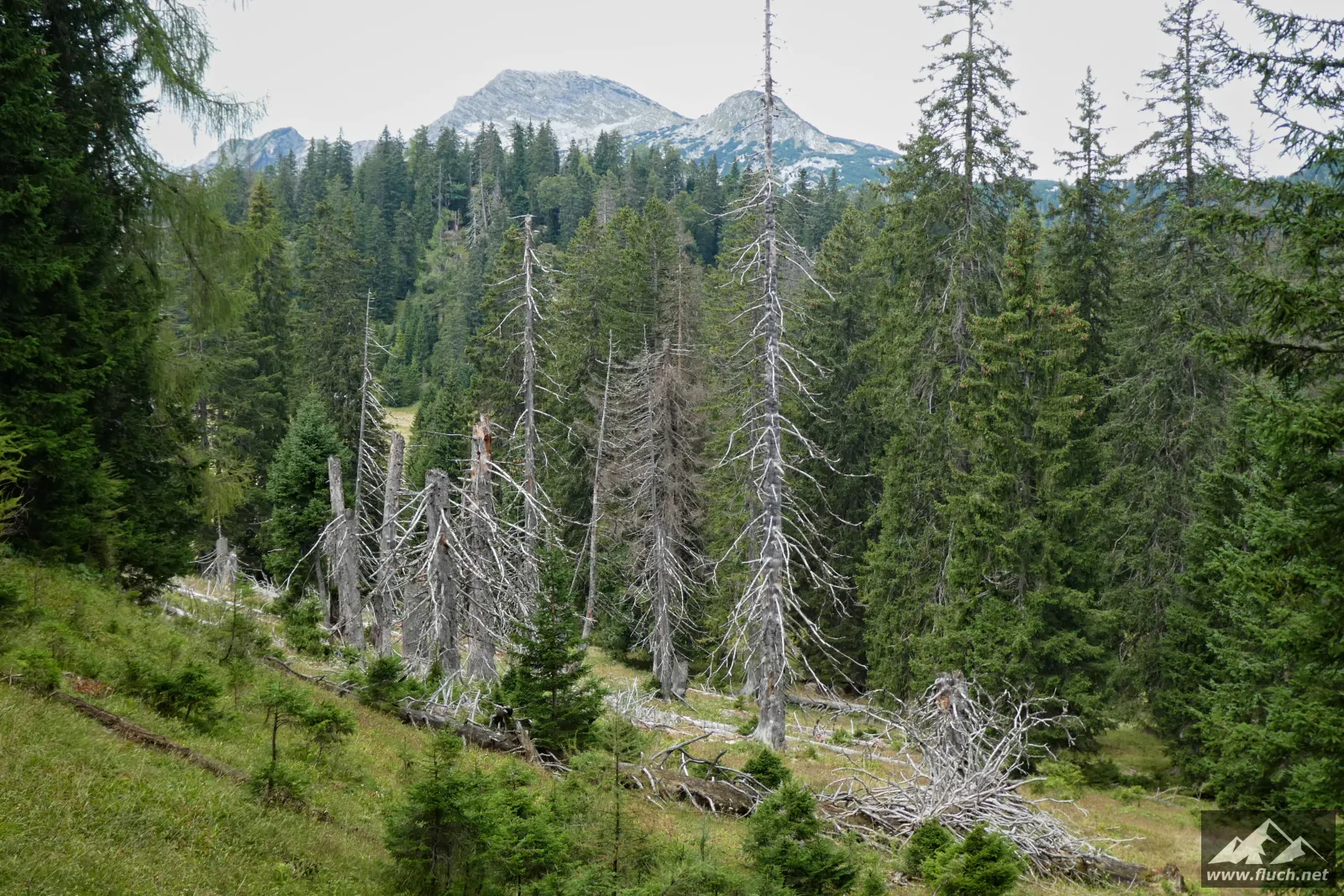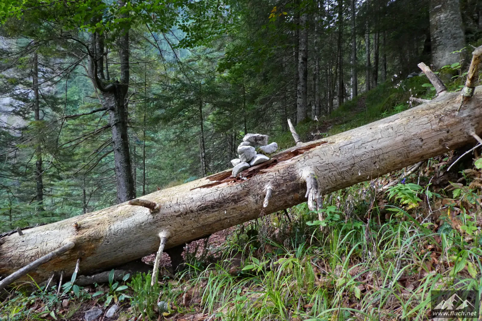 Rechts hinter dem Hochstand auf der Farnerwiese beginnt dann ein schöner Steig hinunter zur Forststraße. Von dort geht es dann zur Sacherlacke (1.250m) weiter, im unteren Bereich ist der Weg aber nicht mehr wirklich zu sehen, hier muss man sich einen eigenen Weg über den Holzschlag suchen.