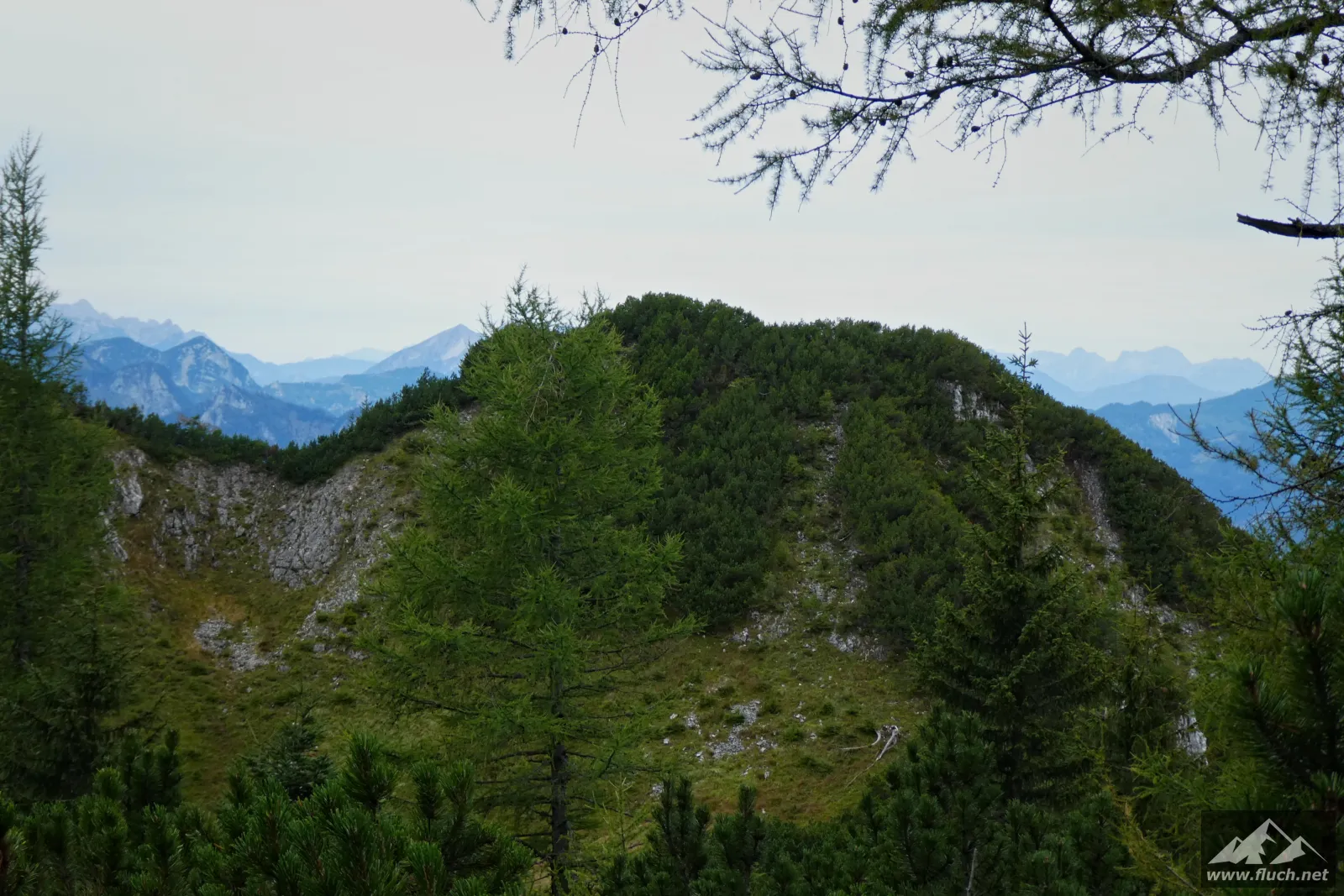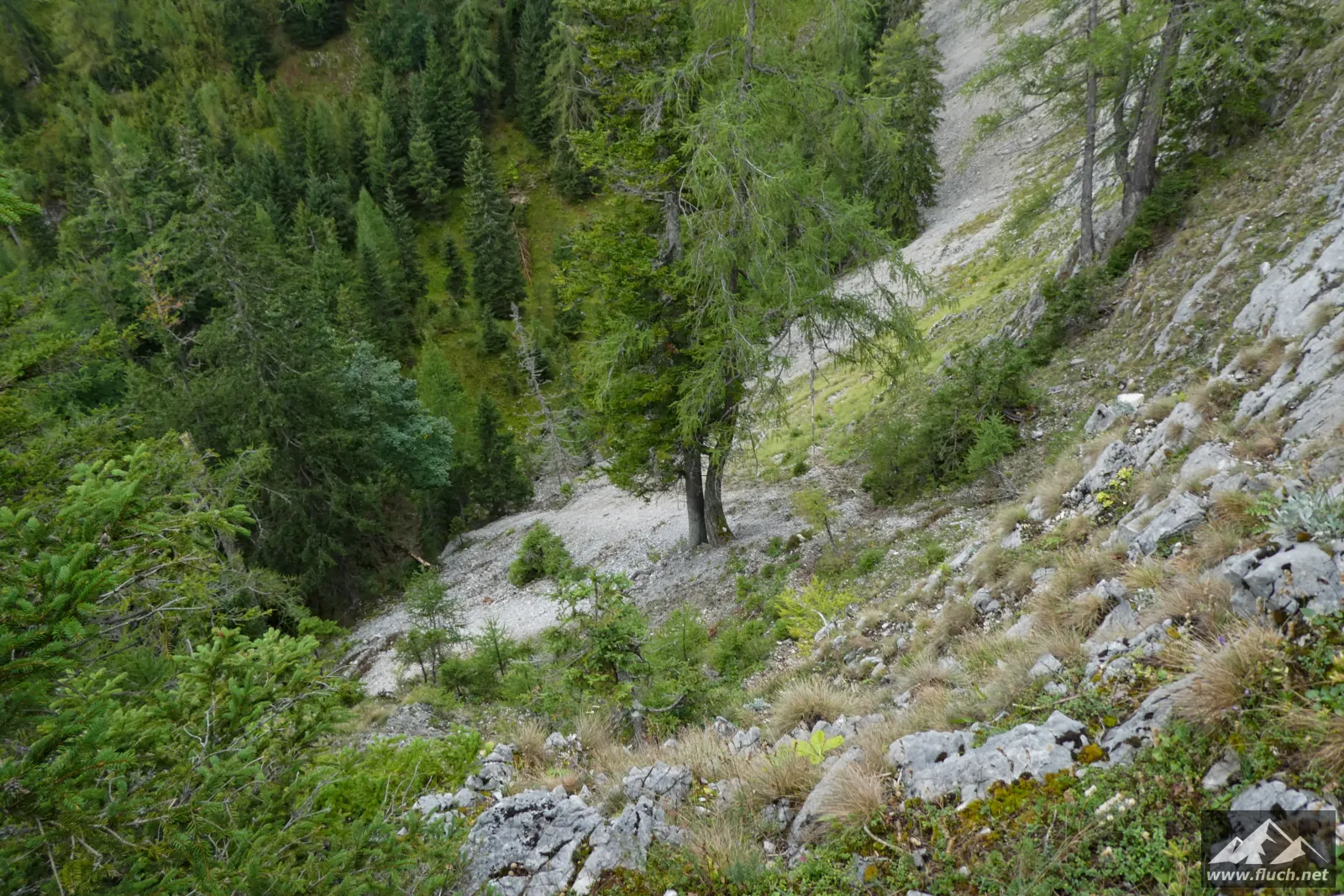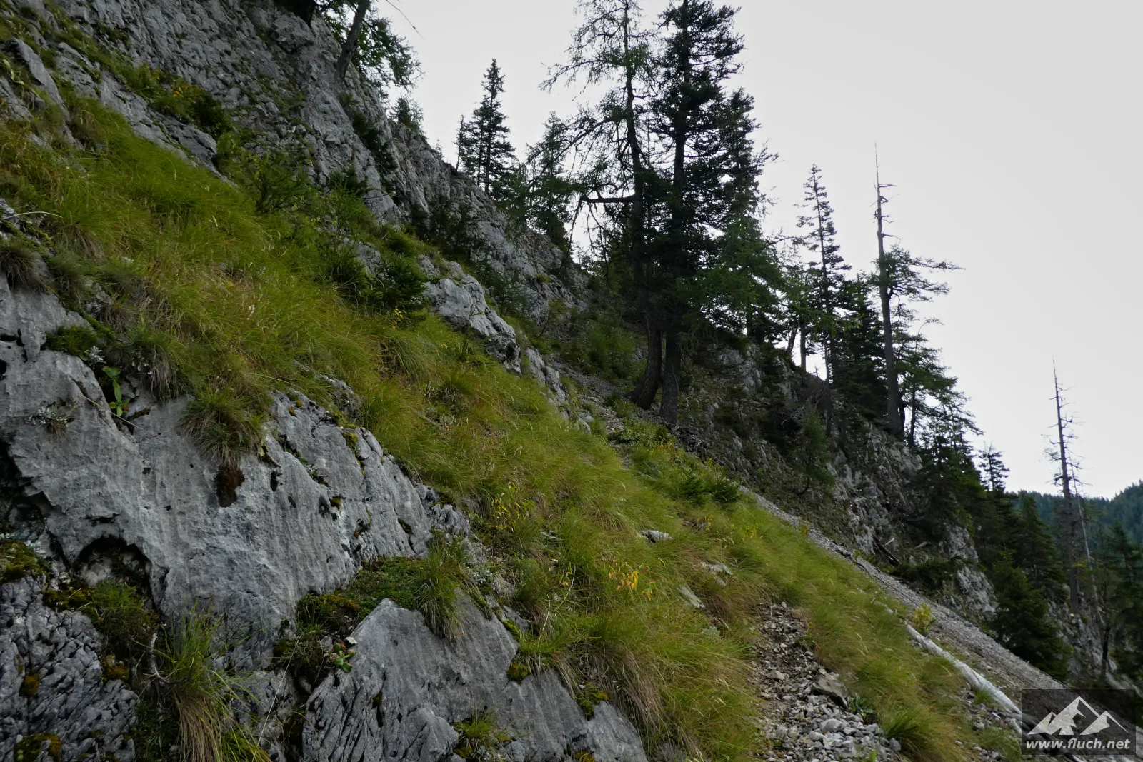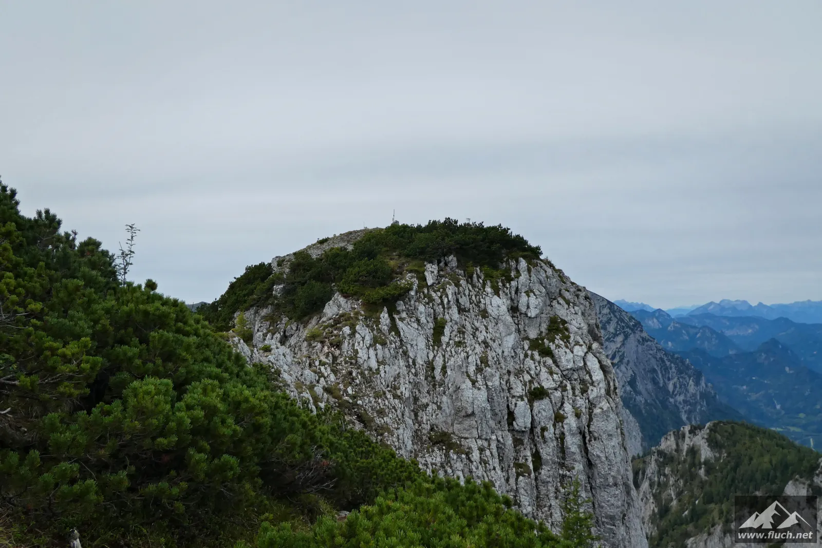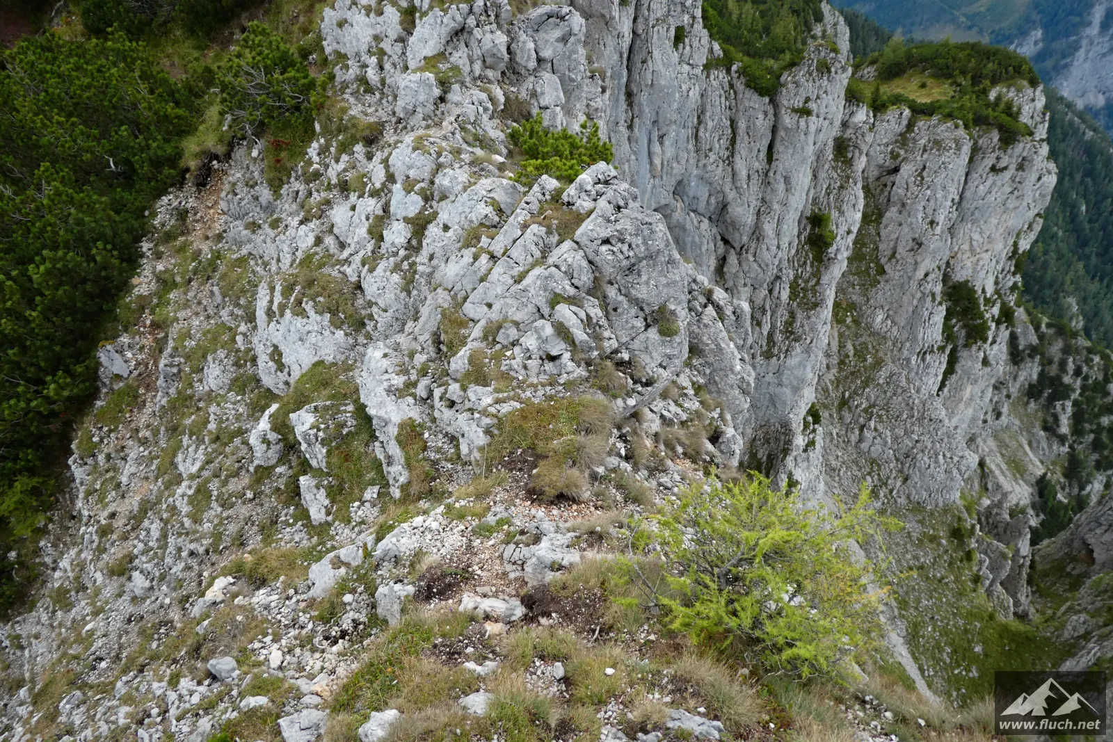 Nach einer steileren Latschengasse gibt es dann einen ersten schönen Blick zum Gipfel, von dort sind es dann nur noch wenige Meter hinauf. Dazwischen wartet aber noch eine ausgesetzte Passage, hier geht es auf beiden Seiten ordentlich nach unten.