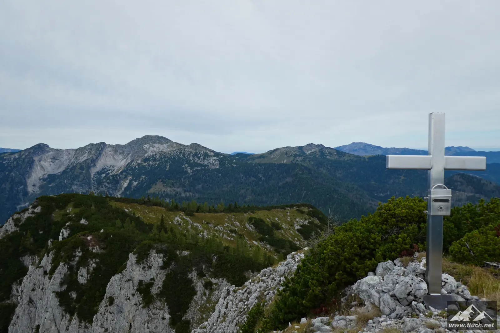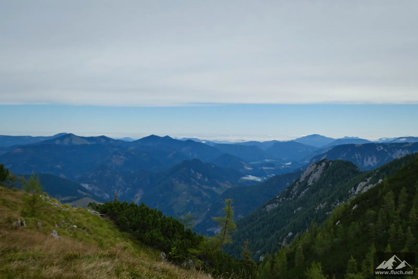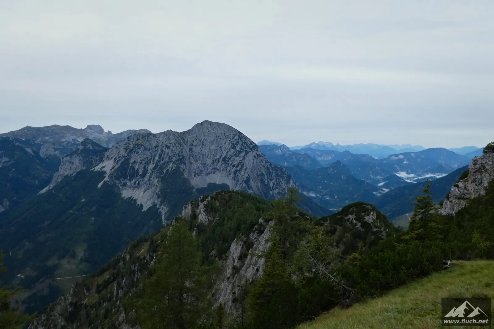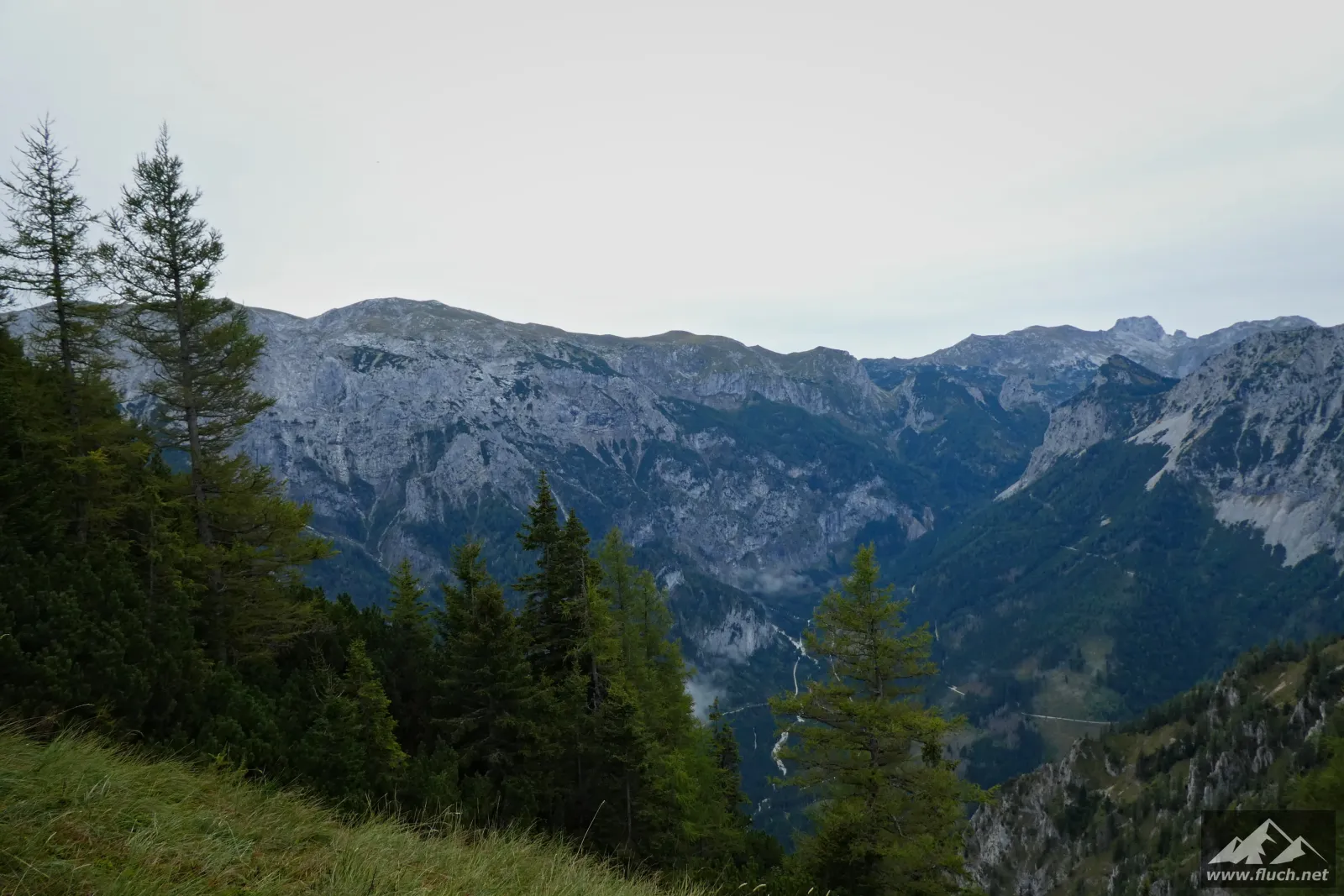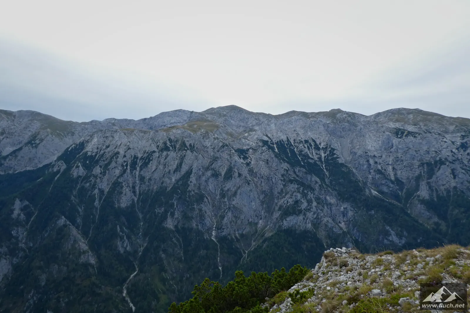 Am Gipfel des Hochtürnach (1.770m) angekommen bot sich dann eine schöne Rundumsicht, vor allem zu den bekannten Gipfeln und Felswänden des gegenüberliegenden Hochschwabs. Auch die Tiefblicke in das Salzatal sind sehr spektakulär.